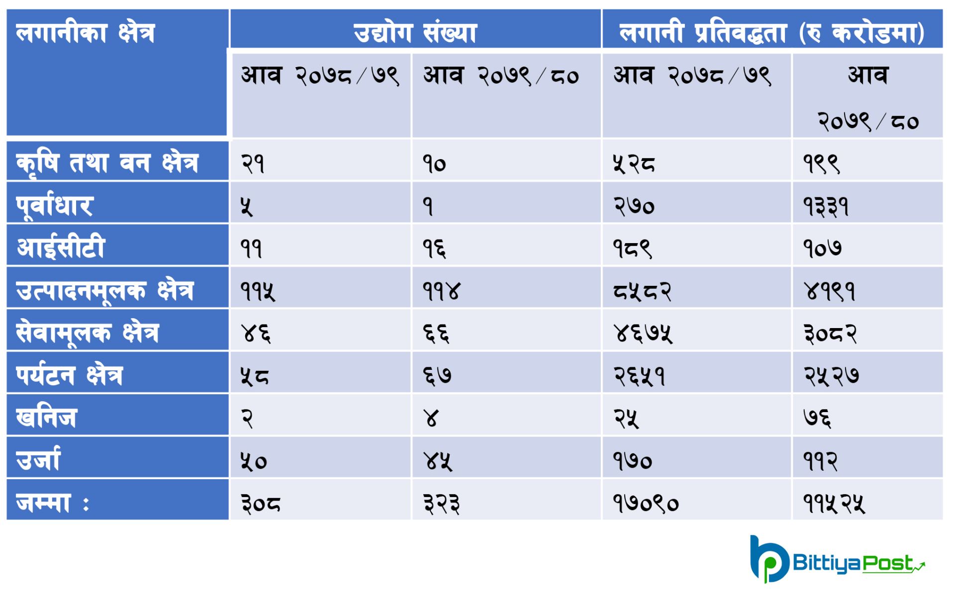 विभागका अनुसार आव २०७९/८० मा आएको लगानीमध्ये सबैभनदा बढी उर्जा क्षेत्रमा आएको छ । यस अवधिमा उर्जा क्षेत्रका ४५ वटा उद्योगका लागि एक अर्ब १२ करोड रुपैयाँ बराबरको लगानी प्रतिवद्धता आएको हो । त्यस्तै, आईसीटी क्षेत्रका १६ उद्योगका लागि एक अर्ब ७ करोड रुपैयाँ लगानी प्रतिवद्धता आएको छ ।