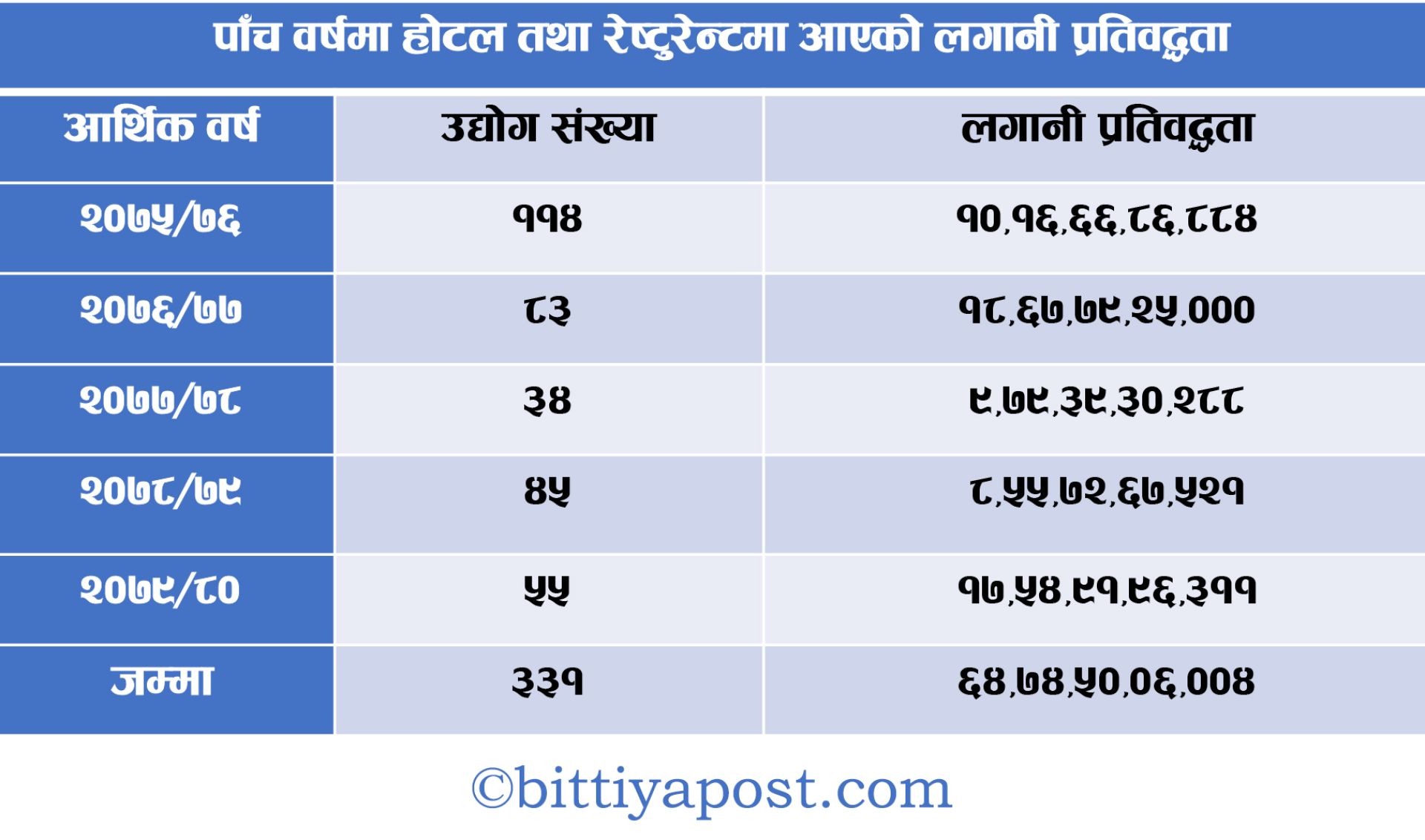 विभागका अनुसार पाँच वर्षको अवधिमा होटल क्षेत्रका लागि ६४ अर्ब रुपैयाँ भन्दा बढीको लगानी प्रतिवद्धता आएको छ । आर्थिक वर्ष २०७५/७६ देखि आव २०७९/८० को अवधिमा होटल क्षेत्र ३३१ उद्योगका लागि ६४ अर्ब ७४ करोड ५० लाख रुपैयाँ बराबरको लगानी प्रतिवद्धता आएको विभागको तथ्यांकमा उल्लेख छ ।