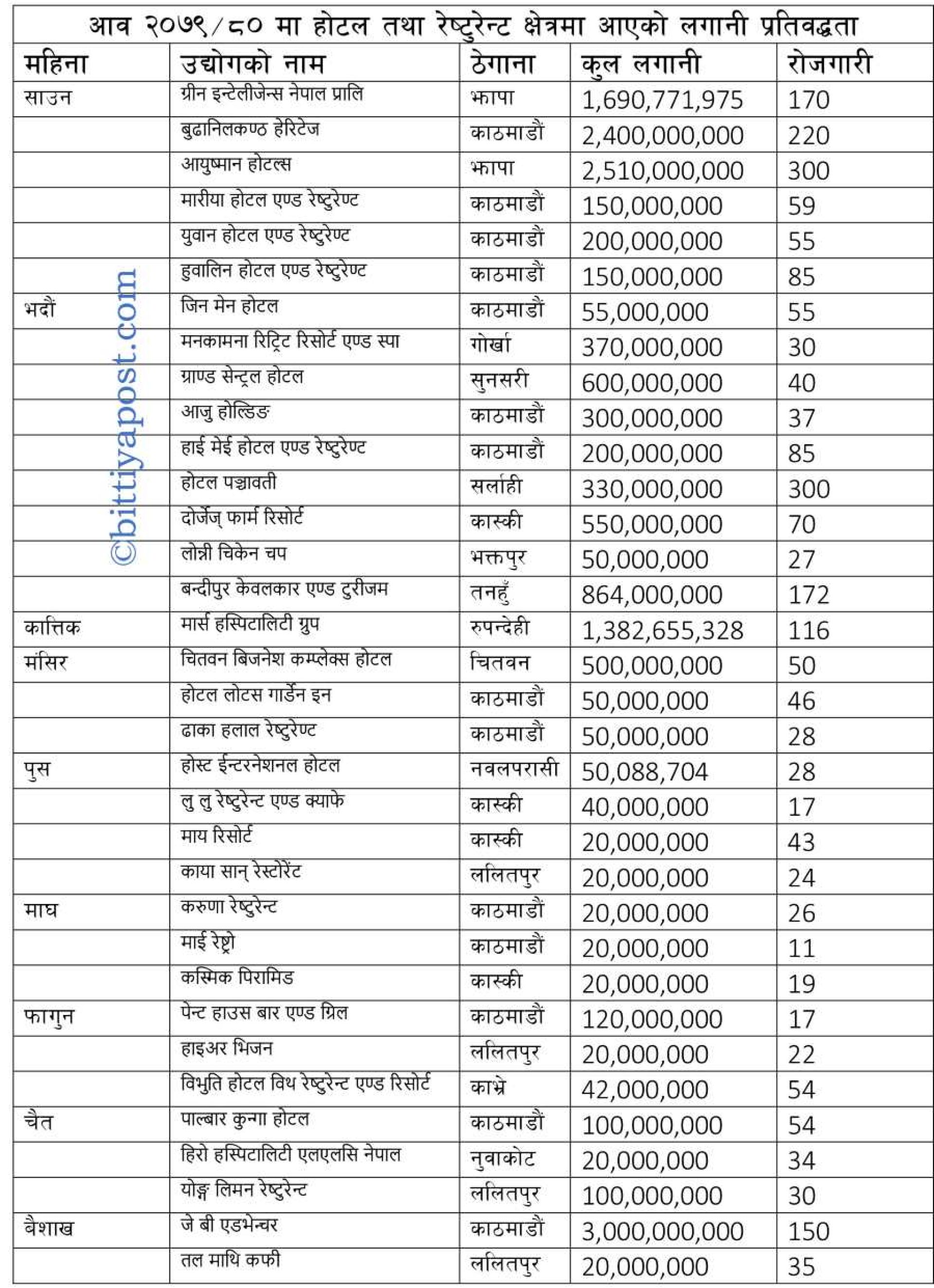 विभागका अनुसार आव २०७९/८० साउन देखि असार मसान्तसम्म साहसिक बाहेक होटल तथा रेष्टुरेन्टका लागि मात्र १७ अर्ब ५४ करोड ९१ लाख ९६ हजार रुपैयाँ बराबरको लगानी प्रतिवद्धता आएको छ । साना, मझौता तथा ठुला गरी ५५ उद्योगका लागि सो बराबरको लगानी आएको हो । यस अवधिमा दर्ता भएका उद्योगमा ३ हजार २८१ जनालाई रोजगारीको प्रतिवद्धता भएको विभागले जनाएको छ । यस अवधिमा दर्ता भएका होटलहरुमा १० वटा क्यासिनोहरु सञ्चालन हुने भएका छन् । जसका लागि २ अर्ब ९ करोड बढीको लगानी प्रतिवद्धता आएको विभागले जनाएको छ ।