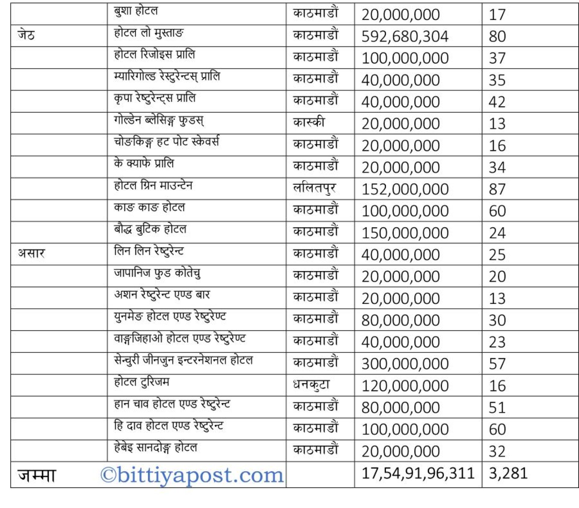 विभागका अनुसार यस अवधिमा दर्ता भएका होटलहरु अधिकांश काठमाडौं केन्द्रीत रहेका छन् । काठमाडौंमा मात्र ३२ वटा होटल तथा रेष्टुरेन्टका लागि ८ अर्ब ५७ करोड ७६ लाख ८० हजार रुपैयाँ लगानी प्रतिवद्धता आएको हो । जसमा एक हजार ५८४ जनाले रोजगारी पाउनेछन् ।