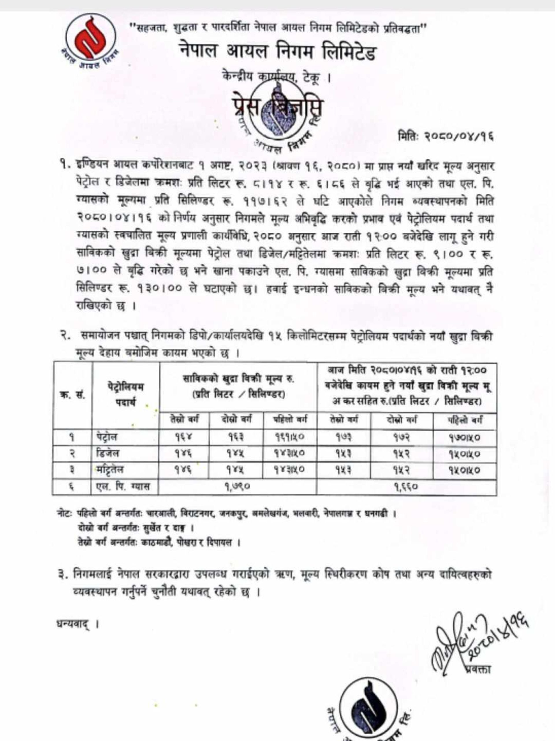 त्यस्तै निगमले पेट्रोल र डिजेलको मूल्य भने बढाएको छ । निगमले स्वचालित प्रणालीअनुसार मूल्य बढाएको हो । निगमले पेट्रोल प्रतिलिटर ९ रुपैयाँ तथा डिजेल र मट्टितेल प्रतिलिटर ७/७ रुपैयाँ बढाएकाे हाे ।