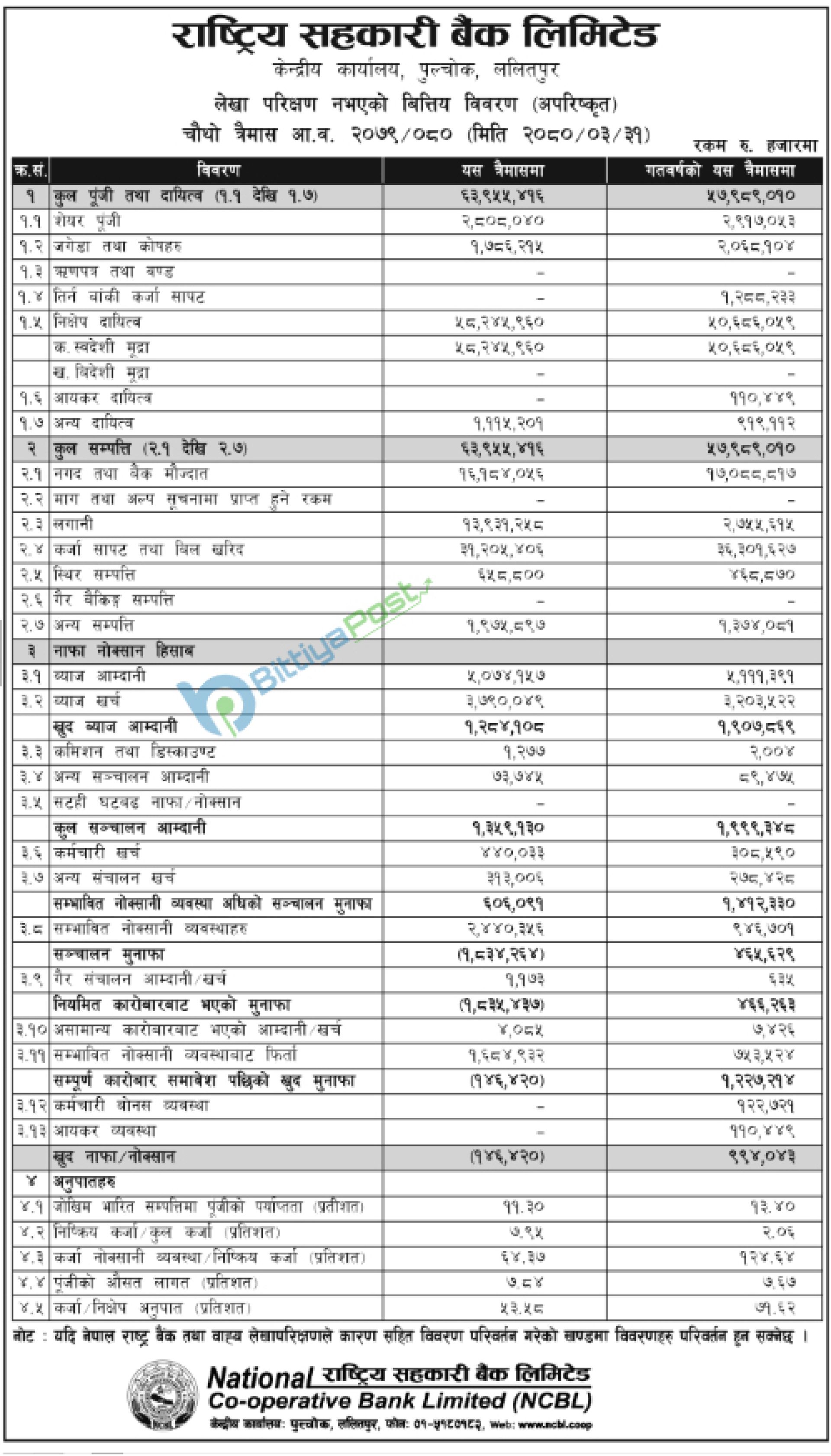 काठमाडौं : राष्ट्रिय सहकारी बैंकले गत आर्थिक वर्षको चौथो त्रैमाससम्मको अपरिष्कृत वित्तीय विवरण सार्वजनिक गरेको छ । उक्त वित्तीय विवरण अनुसार बैंक १४ करोड रुपैयाँ भन्दा बढी घाटामा रहेका छ ।
