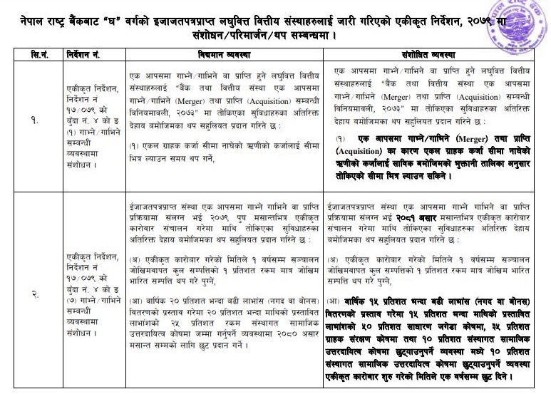 राष्ट्र बैंकले एकीकृत निर्देशन परिमार्जन गर्दै अब एक आपसमा गाभ्ने/गाभिने तथा प्राप्तिका कारण एकल ग्राहक कर्जा सीमा नाघेको ऋणीको कर्जालाई साविक बमोजिमको भुक्तानी तालिका अनुसार तोकिएको सीमा भित्र ल्याउन सकिने व्यवस्था गरेको छ ।