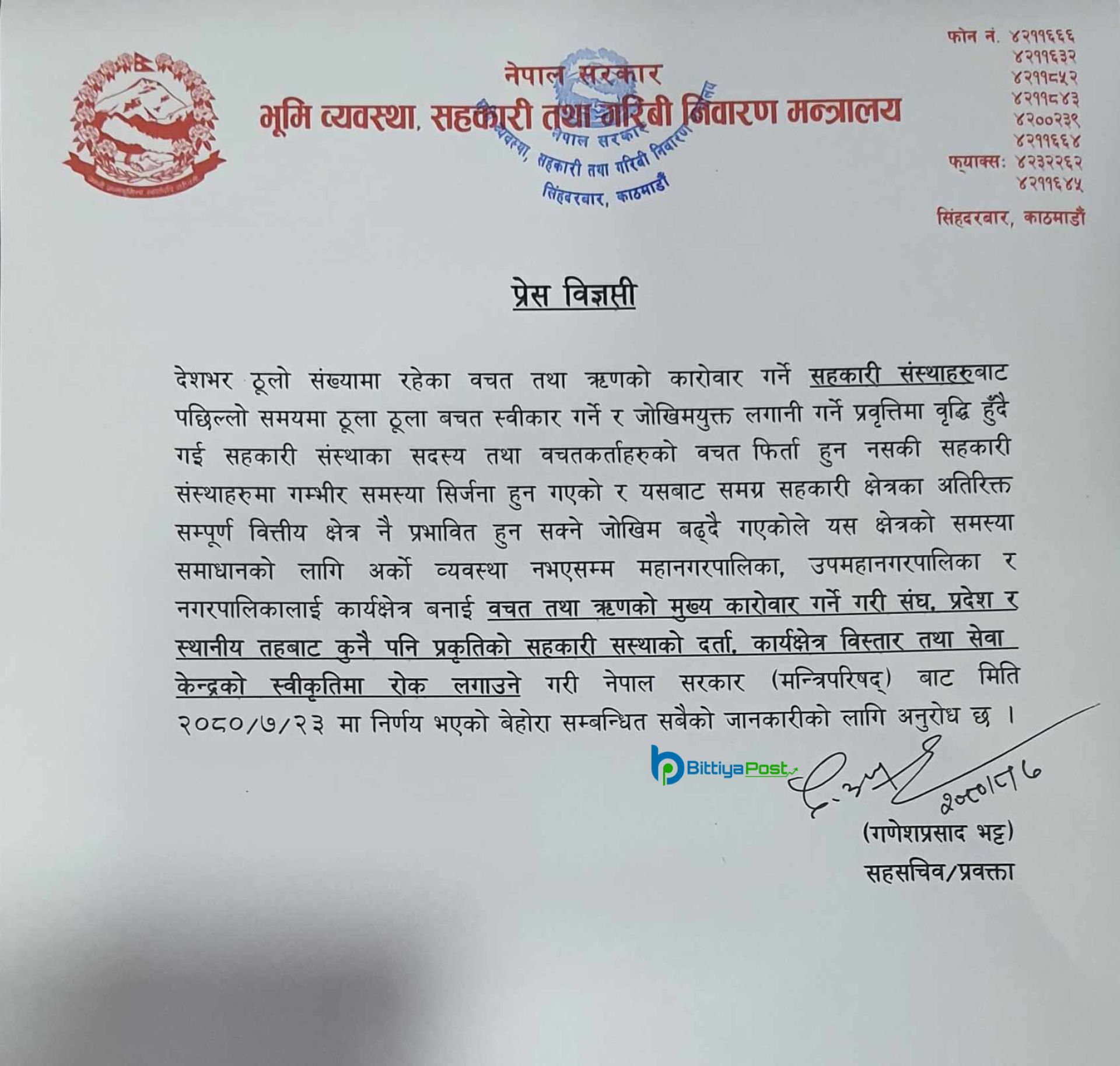 संघ, प्रदेश र स्थानीय तहबाट सहकारीको दर्ता, कार्यक्षेत्र विस्तार तथा सेवा केन्द्रको स्वीकृतिमा रोक लगाउने नेपाल सरकारको मन्त्रिपरिषद् बैठकले निर्णय गरेको हो । कार्तिक २३ गते बसेको बैठकले गरेको निर्णय आज नेपाल सरकार भूमि व्यवस्था, सहकारी तथा गरिबी निवारण मन्त्रालयले विज्ञप्ति सबै पक्षलाई जानकारी गराएको हो ।