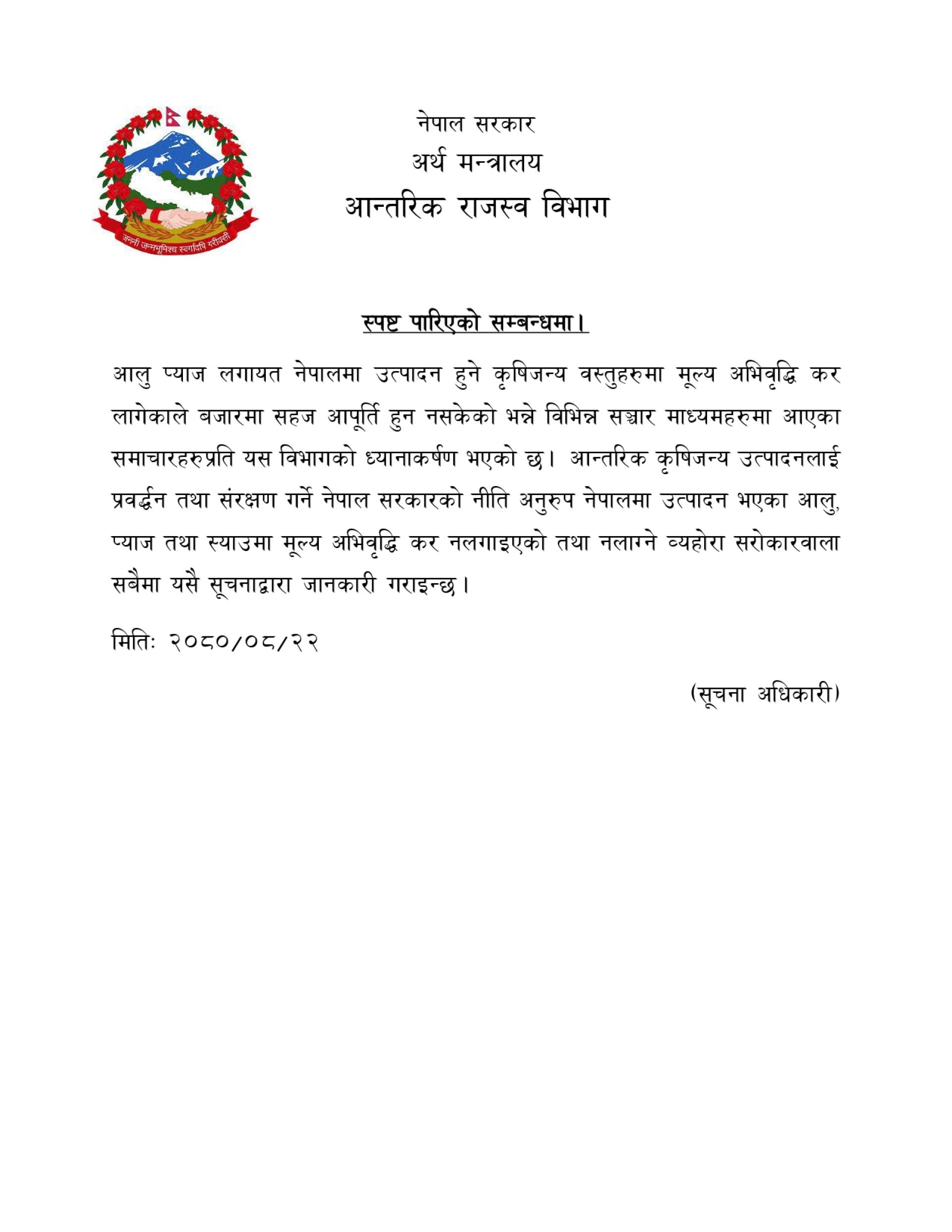 विभागद्वारा जरी विज्ञप्तीमा भनिएको छ, ‘आन्तरिक कृषिजन्य उत्पादनलाई प्रवर्द्धन र संरक्षण गर्ने नेपाल सरकारको नीति अनुरुप नेपालमा उत्पादन भएका आलु, प्याजमा मूल्य अभिवृद्धि कर नलगाइएको र नलाग्ने व्यहोरा सरोकारवाला सबैमा यसै सूचनाद्वारा जानकारी गराइन्छ ।’