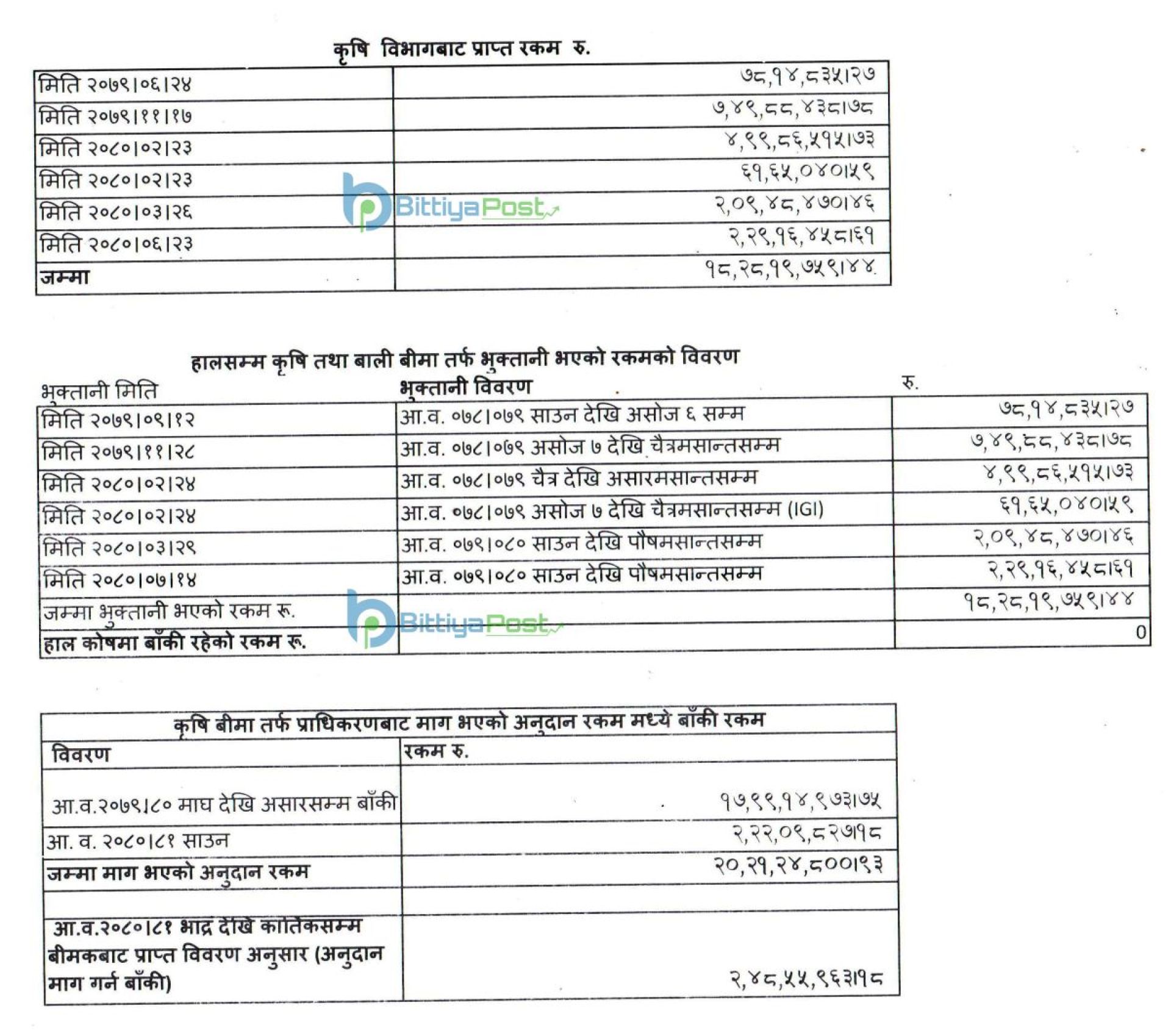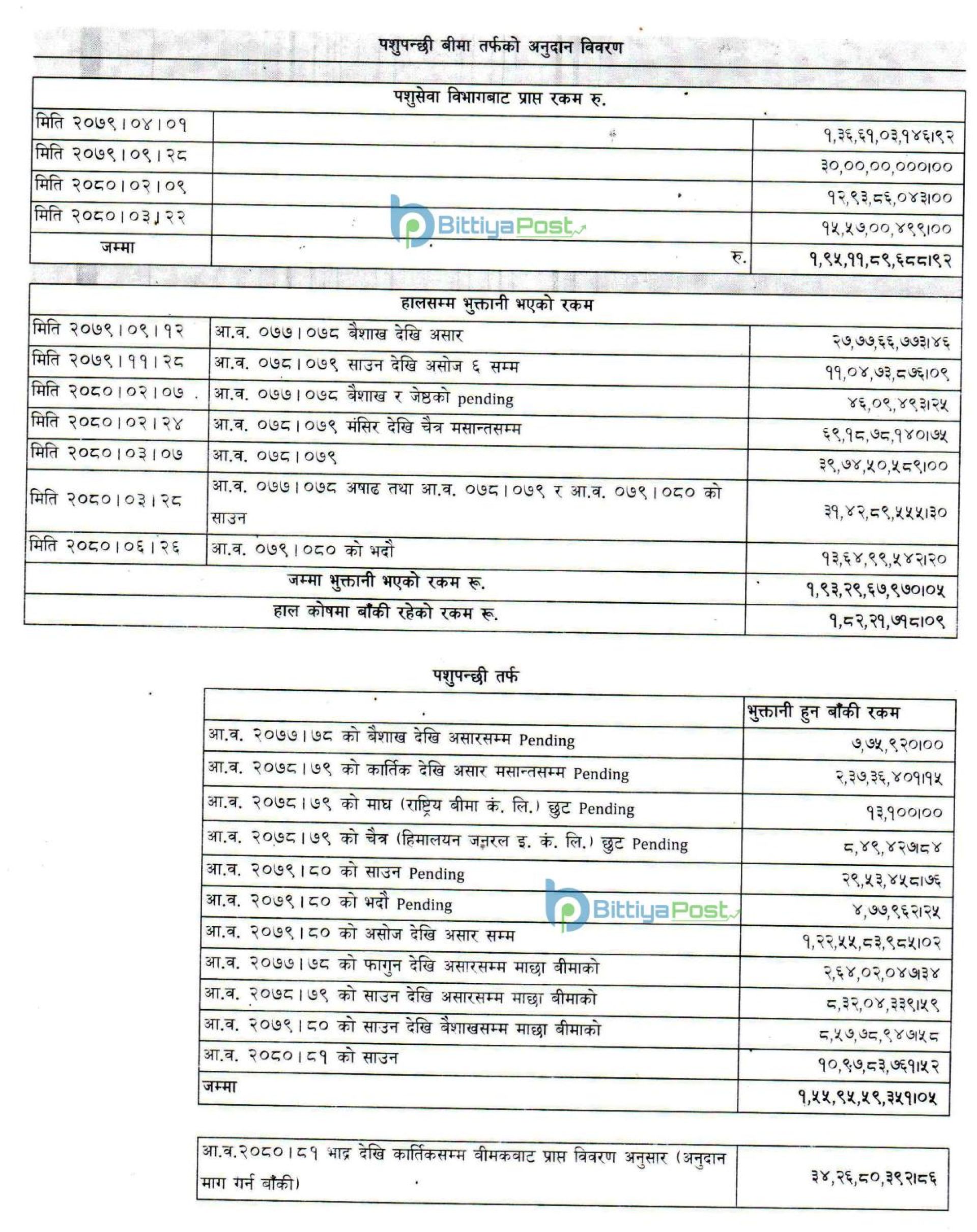 यसैगरी, कृषि बीमातर्फको अनुदान बापत अजोड इन्स्योरेन्सको १५ करोड ९२ लाख रुपैयाँ, नेपाल इन्स्योरेन्सको ११ करोड १६ लाख रुपैयाँ, दि ओरियन्टलको १० करोड ६८ लाख रुपैयाँ, सानिमा जिआईसी इन्स्योरेन्सको ९ करोड ७७ लाख रुपैयाँ, युनाईटेड इन्स्योरेन्सको ९ करोड २ लाख रुपैयाँ, प्रभु इन्स्योरेन्सको ६ करोड ४२ लाख रुपैयाँ र राष्ट्रिय बीमा कम्पनीको २ करोड ५० लाख रुपैयाँ भुक्तान बाँकी रहेको छ ।