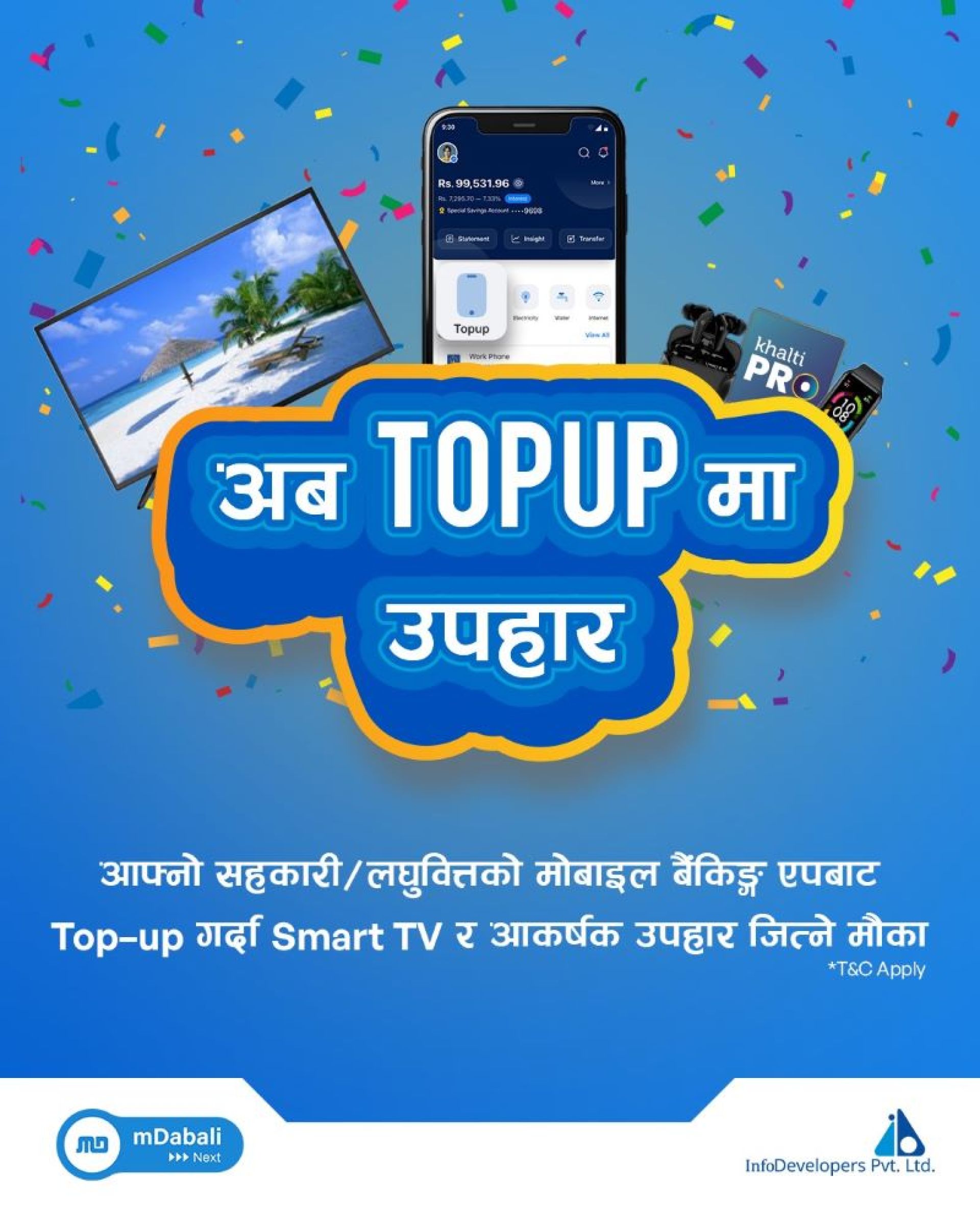 काठमाडौं : इन्फोडेभलपर्सले आफ्नो मोबाइल बैंकिङ्ग एपको नयाँ योजना अन्तर्गत ‘अब टप-अपमा उपहार’ शुरू गरेको छ । योजना अन्तर्गत ग्राहकहरुले आफ्नो सहकारी/लघुवित्तको मोबाइल बैंकिङ्ग एपमार्फत एनटिसी र एनसेल दुवै नम्बरमा टप-अप गर्दा स्मार्ट टिभी र आकर्षक उपहार जित्ने मौका पाउने छन् ।