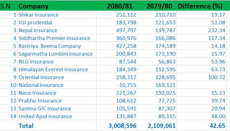 पुस मसान्तसम्म आइपुग्दा सबैभन्दा धेरै नाफा कमाउनेमा नेपाल इन्स्योरेन्स रहेको छ । यस अवधिमा कम्पनीले ४९ करोड ७७ लाख रुपैयाँ खुद नाफा कमाएको छ । जुन गत वर्षको तुलनामा भने २३२.३४ प्रतिशत बढी हो ।