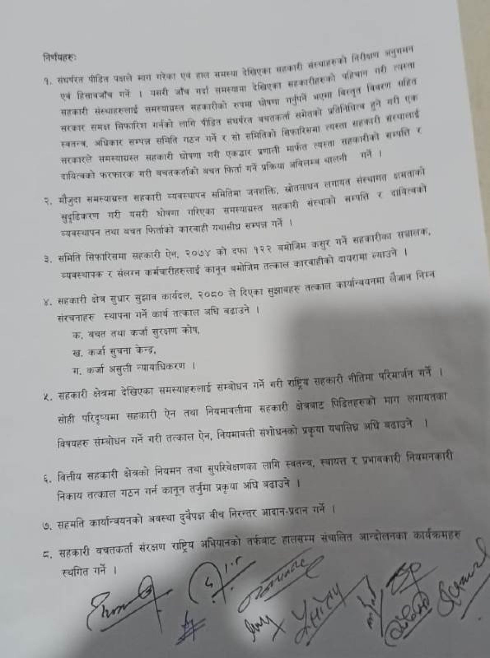 सरकारले कर्जा सूचना केन्द्र, सुरक्षण कोष, असुली न्यायधिकरण तत्काल कार्यान्वयनमा लैजाने सहमति भएको छ । हाल देखिएका सहकारी संस्थाहरुको निरक्षण अनुगमन गरी हिसाव जाँच गर्ने समेत सहमती भएको छ । जाँच गर्दा समस्यामा देखिएका सहकारी संस्थाको पहिचान गरी त्यस्ता संस्थाहरुलाई समस्याग्रस्त घोषणा गर्नुपर्ने भएमा विस्तृत बिवरण सहित सरकारलाई सिफारिस गर्नका लागि पीडित बचतकर्ताको समेत प्रतिनिधित्व हुने गरी एक स्वतन्त्र समिति गठन गर्ने सहमती भएको हो।