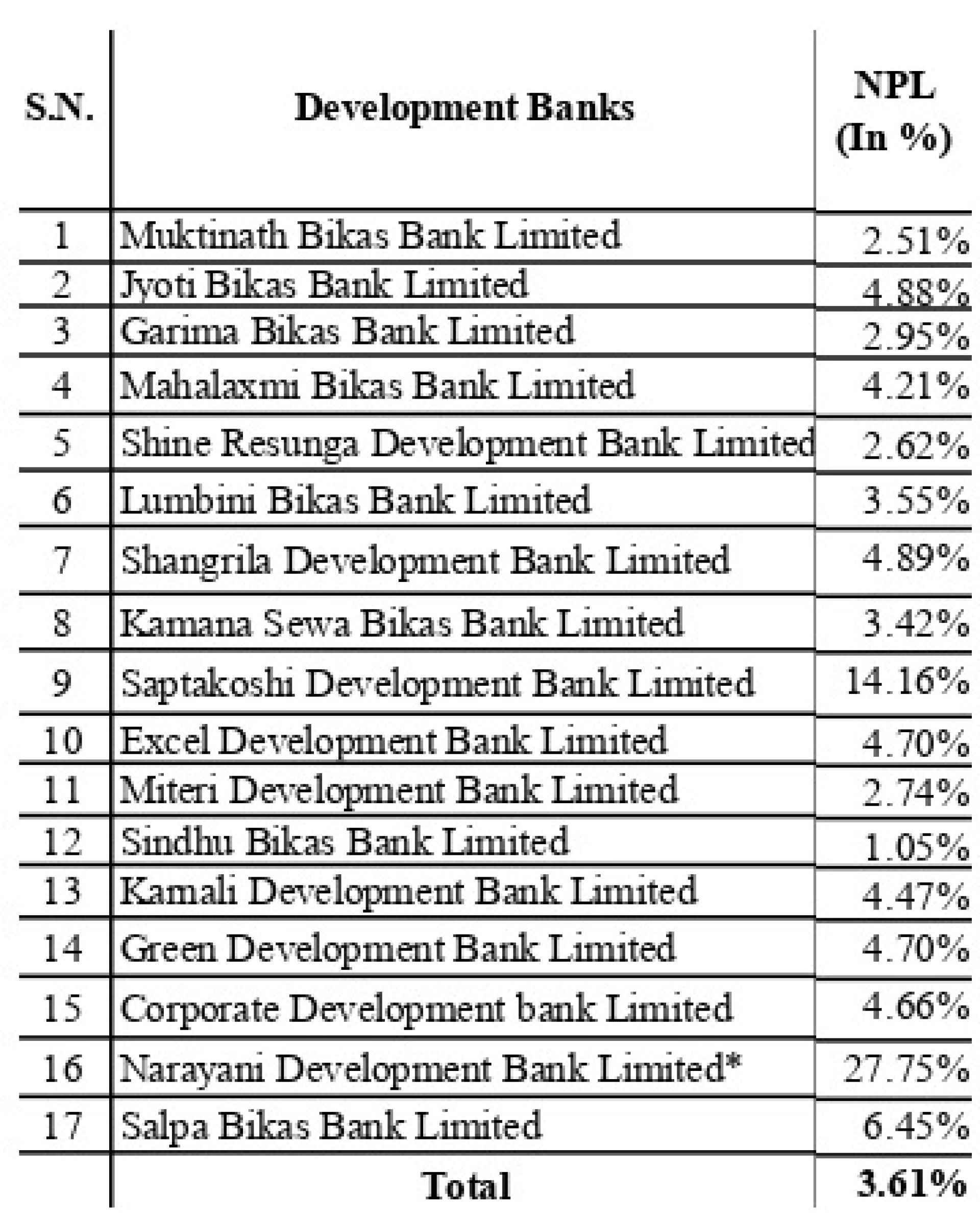 त्यसैगरी, मुक्तिनाथ विकास बैंकका २.५१ प्रतिशत रहेको छ भने ज्योति विकास बैंकको ४.८८ प्रतिशत, गरिमा विकास बैंकको २.९५ प्रतिशत र महालक्ष्मी विकास बैंकको ४.२१ प्रतिशत रहेको राष्ट्र बैंकको तथ्यांकमा उल्लेख छ ।
