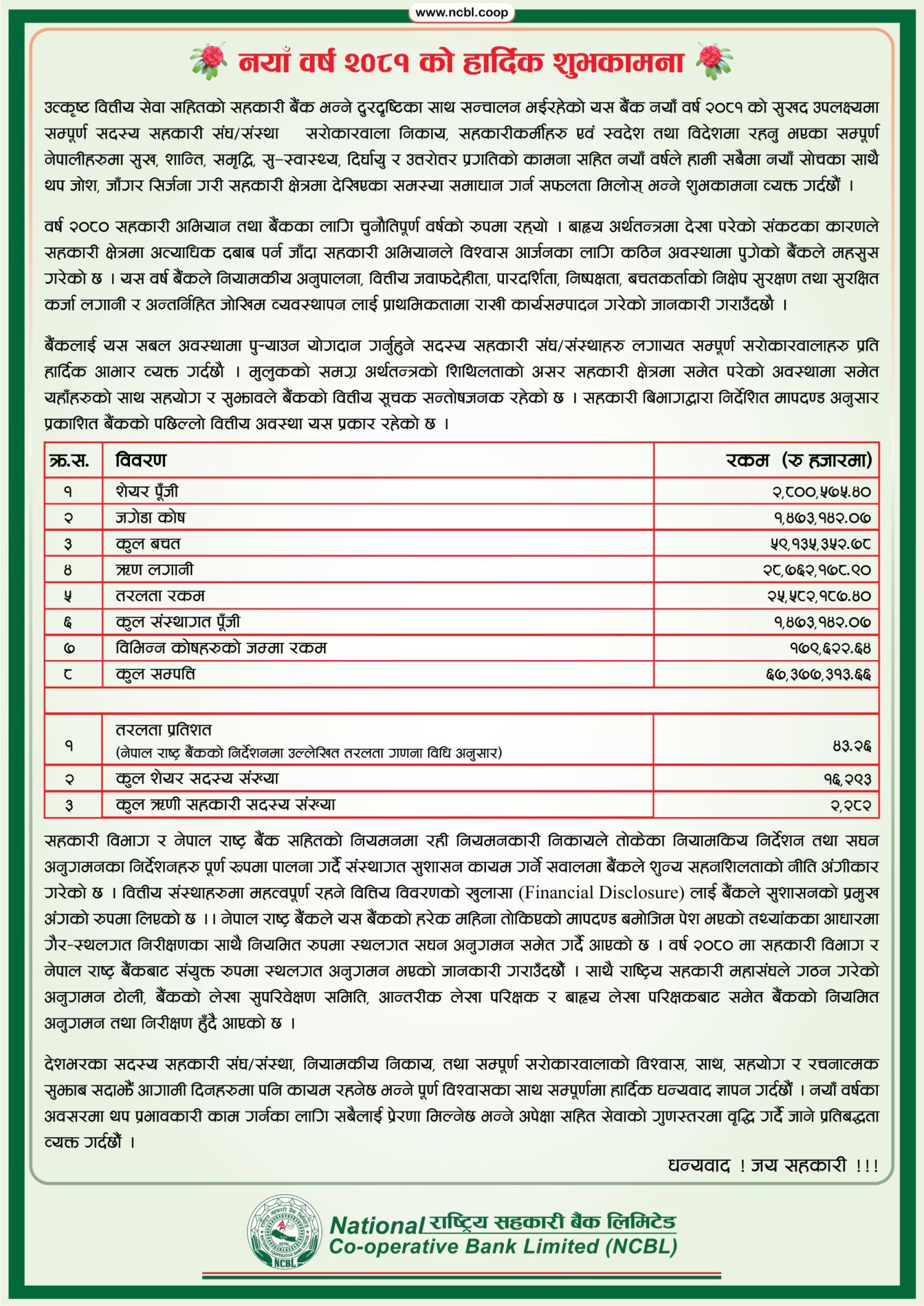 नयाँ वर्ष २०८१ सालको सुखद उपलक्ष्यमा बैंकका सम्पूर्ण सदस्य सहकारी संघ/संस्था सरोकारवाला निकाय, सहकारीकर्मीहरुमा शनिवार शुभकामना सन्देश जारी गर्दै बैंकले नियामकीय अनुपालना, वित्तीय जबाफदेहिता, पारदर्शिता, निष्पक्षता, बचतकर्ताको निक्षेप सुरक्षण तथा सुरक्षित कर्जा लगानी र अन्र्तनिहित जोखिम व्यवस्थापन लाई प्राथमिकतामा राखी कार्यसम्पादन गरेको बताएको छ ।