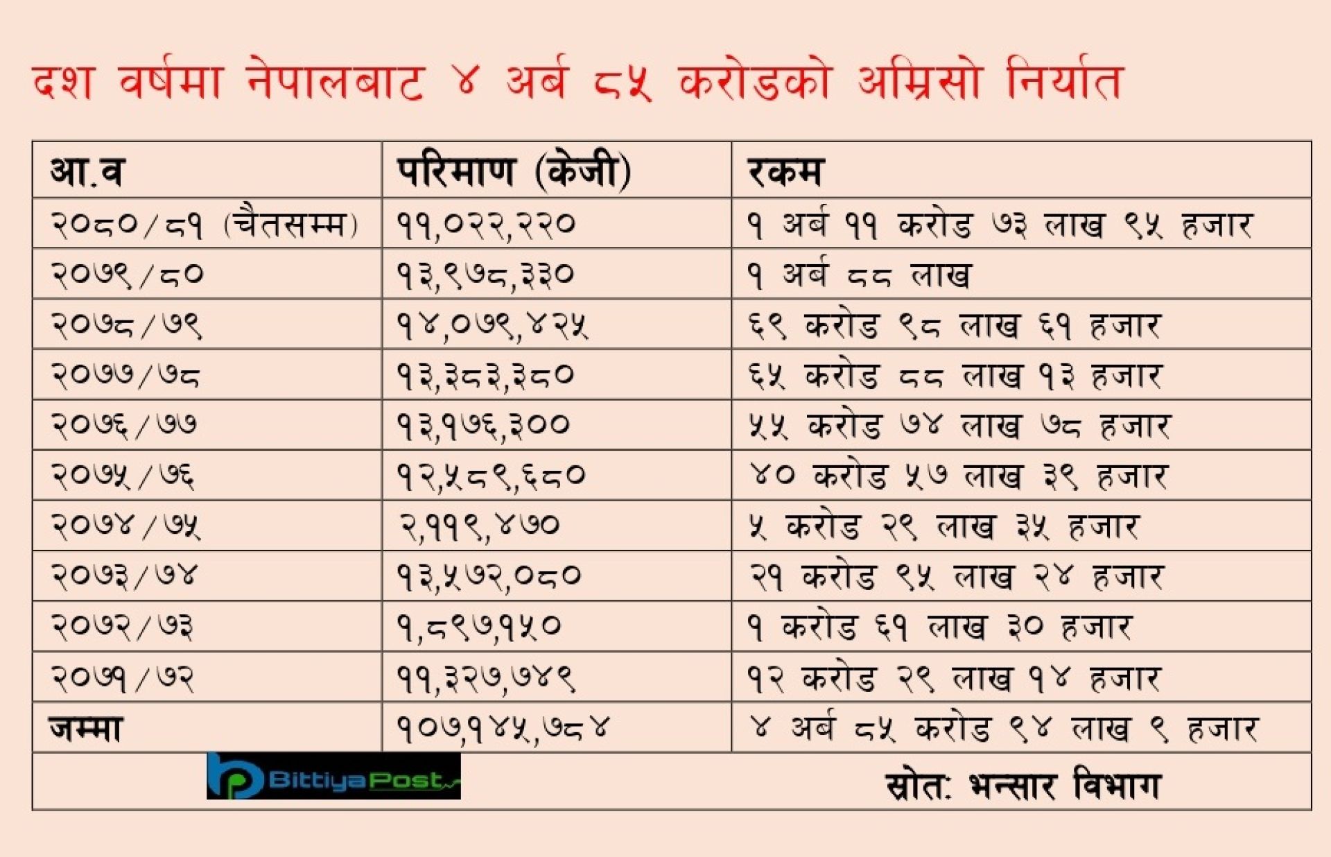 यो दश वर्षको अवधिमा भारतमा मात्रै ४ अर्ब ८४ करोड ८४ लाख ६ हजार रुपैयाँको अम्रिसो निर्यात भएको छ । यसका साथै बङ्गलादेशमा एक करोड १० लाख ६ हजार रुपैयाँ र चीनमा एक लाख ७६ हजार रुपैयाँको अम्रिसो निर्यात भएको विभागको तथ्यांकमा उल्लेख छ ।
