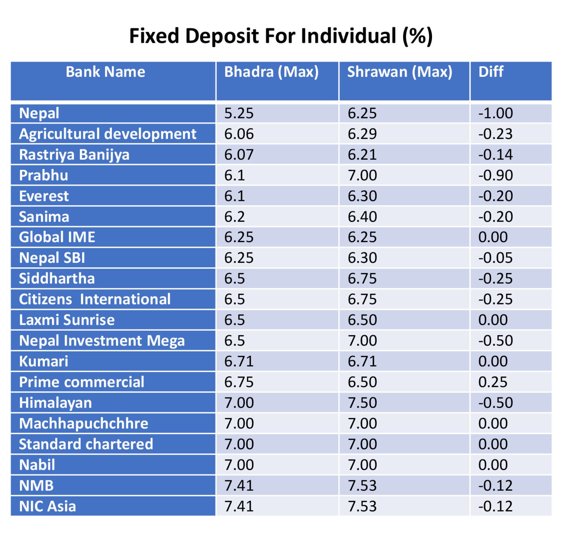 २० वाणिज्य बैंकहरु मध्ये १३ वटा बैंकहरुले ब्याजदर घटाएका छन् भने ६ बैंकहरुले साउन महिनाकै ब्याजदरलाई निरन्तरता दिएका छन् । तर प्राईम बैंकले भने ब्याजदर बढाएको छ । प्राईम बैंकले साउन महिनाको तुलनामा ०.२५ प्रतिशतले बढाएको छ ।