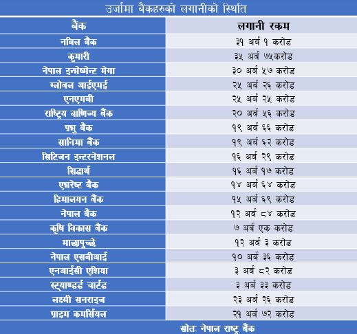 राष्ट्र बैंकका अनुसार ग्लोबल आईएमईले २५ अर्ब ५६ करोड, एनएमबीले २५ अर्ब २५ करोड, लक्ष्मी सनराइजले २३ अर्ब २६ करोड, प्राइम कमर्सियल बैंकले २१ अर्ब ७२ करोड, राष्ट्रिय वाणिज्य बैंकले २० अर्ब ५६ करोड रुपैयाँ ऊर्जा क्षेत्रमा लगानी गरेका छन् ।