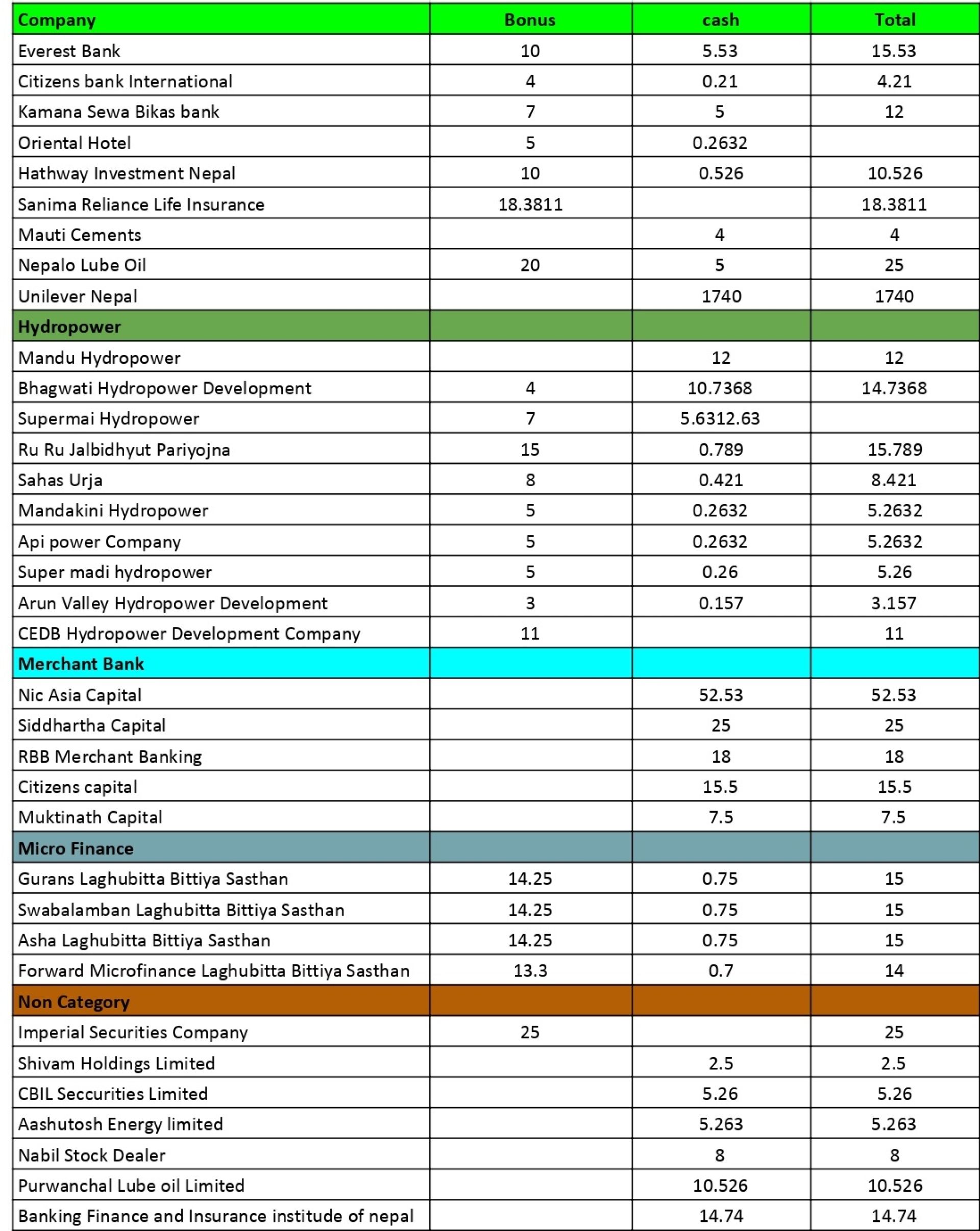 यकास साथै विकास बैंक तर्फ कामना सेवा विकास बैंंक, होटल तर्फ ओरियन्टल होटल र बीमा कम्पनीतर्फ सानिमा रिलायन्स लाइफ इन्स्योरेन्सले पनि गत आर्थिक वर्षको मुनाफाबाट शेयरधनीहरूलाई लाभांश वितरण गर्ने भएका हुन् ।