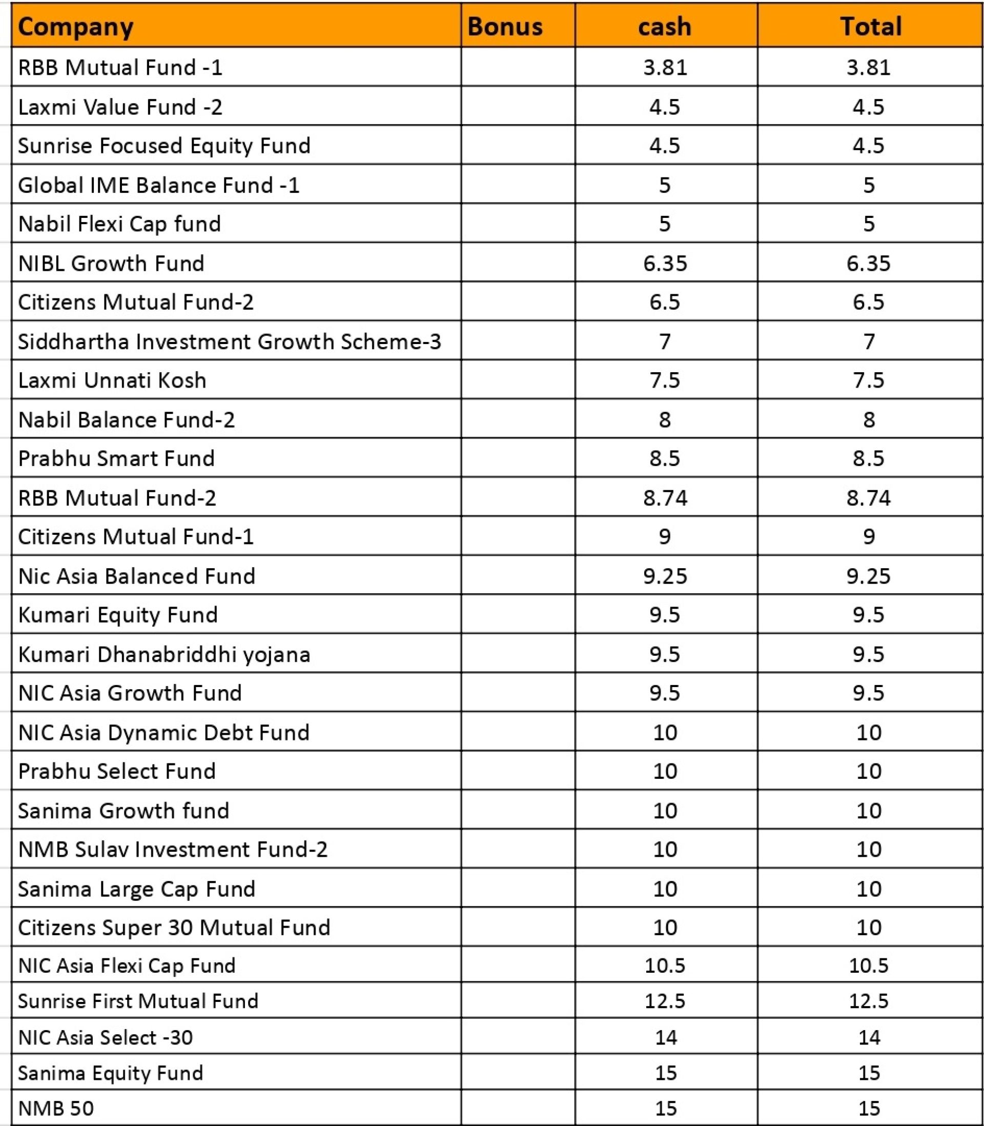 यस अवधिमा २८ म्युचुअल फण्डले गत आर्थिक वर्षको मुनाफाबाट इकाईधनीहरुलाई वितरण गर्ने लाभांश घोषणा गरको छन् । कम्पनीहरुले न्यूनतम ४.४ प्रतिशतदेखि अधिकतम १५ प्रतिशतसम्म लाभांश प्रस्ताव गरेका छन् ।