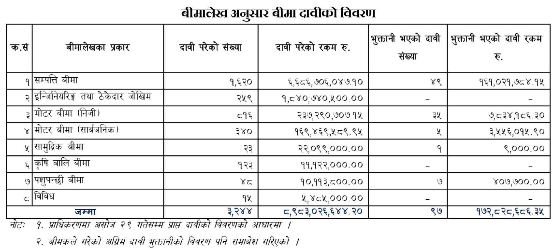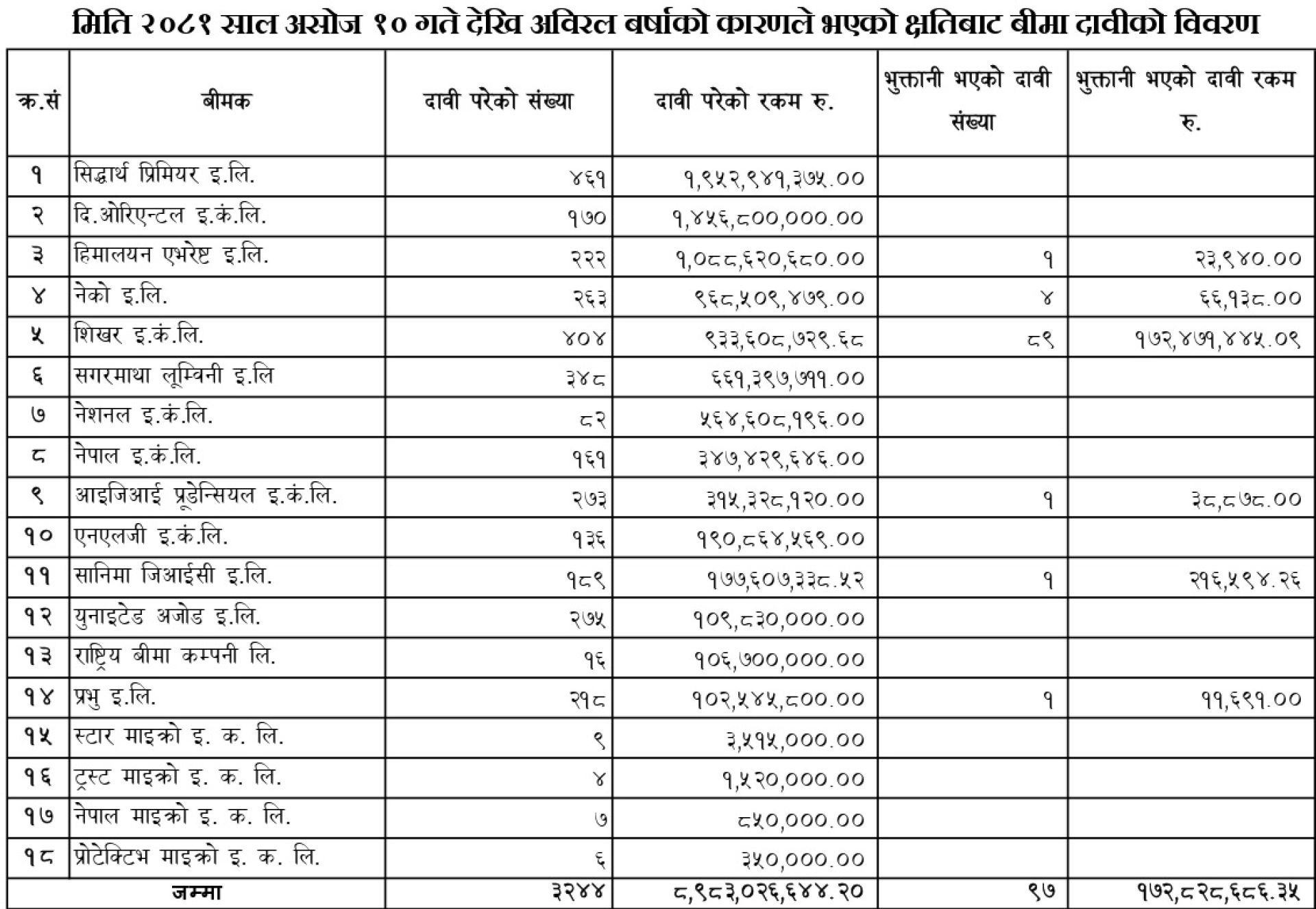 प्राधिकरणका अनुसार असोज २९ गतेसम्म १४ वटा निर्जीवव बीमा कम्पनी चार वटा निर्जीवन लघु बीमा कम्पनी गरी ३ हजार २४४ वटा दाबी परेका छन् ।