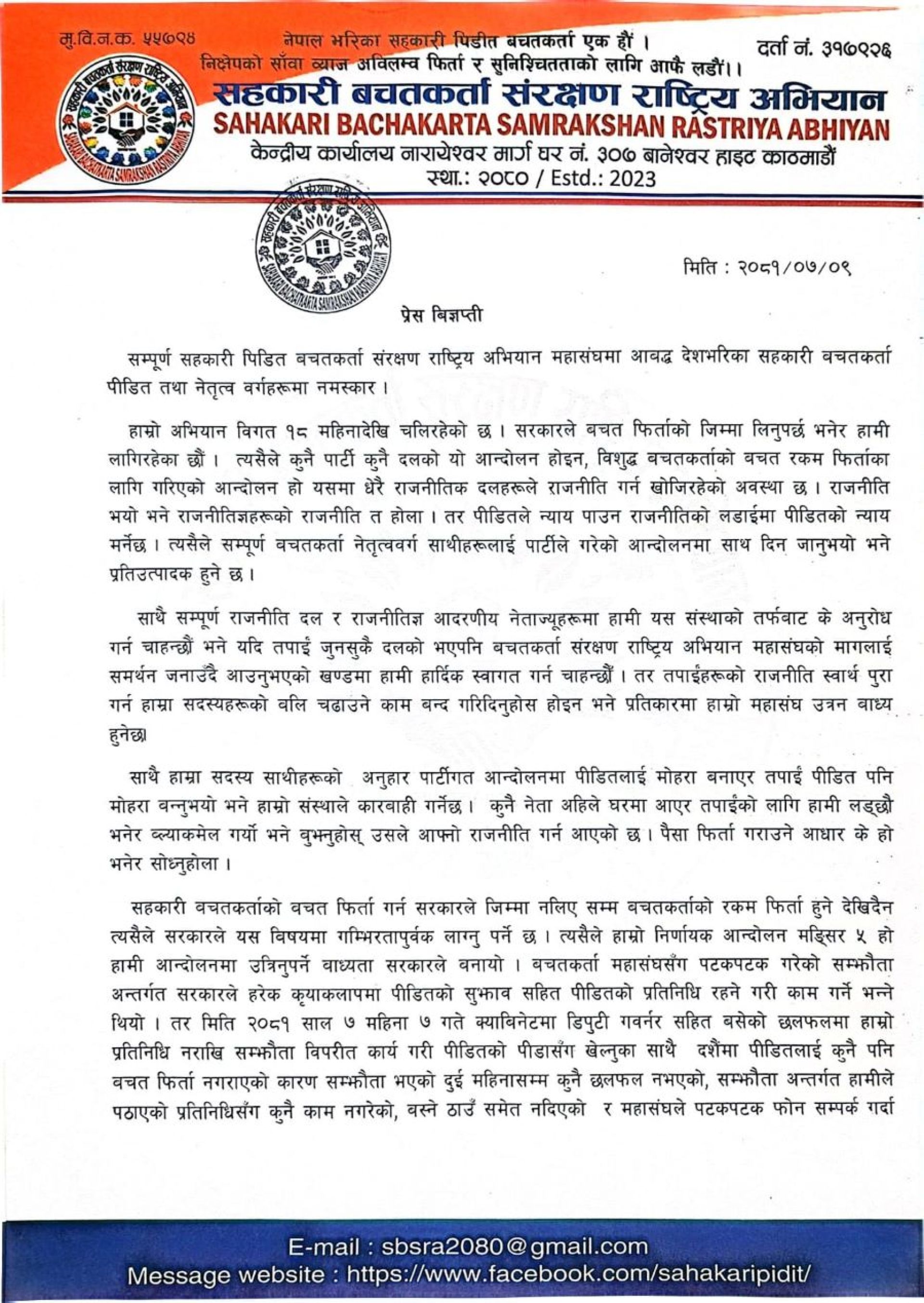 सहकारी बचतकर्ता संरक्षण राष्ट्रिय अभियानले आज (कात्तिक ९ गते) विज्ञप्ति जारी गर्दै सरकारले बचत फिर्ताको जिम्मा नलिएसम्म रकम फिर्ता हुने अवस्था नदेखिएकोले आन्दोलन गर्नुपर्ने अवस्था आएको बताएको छ।