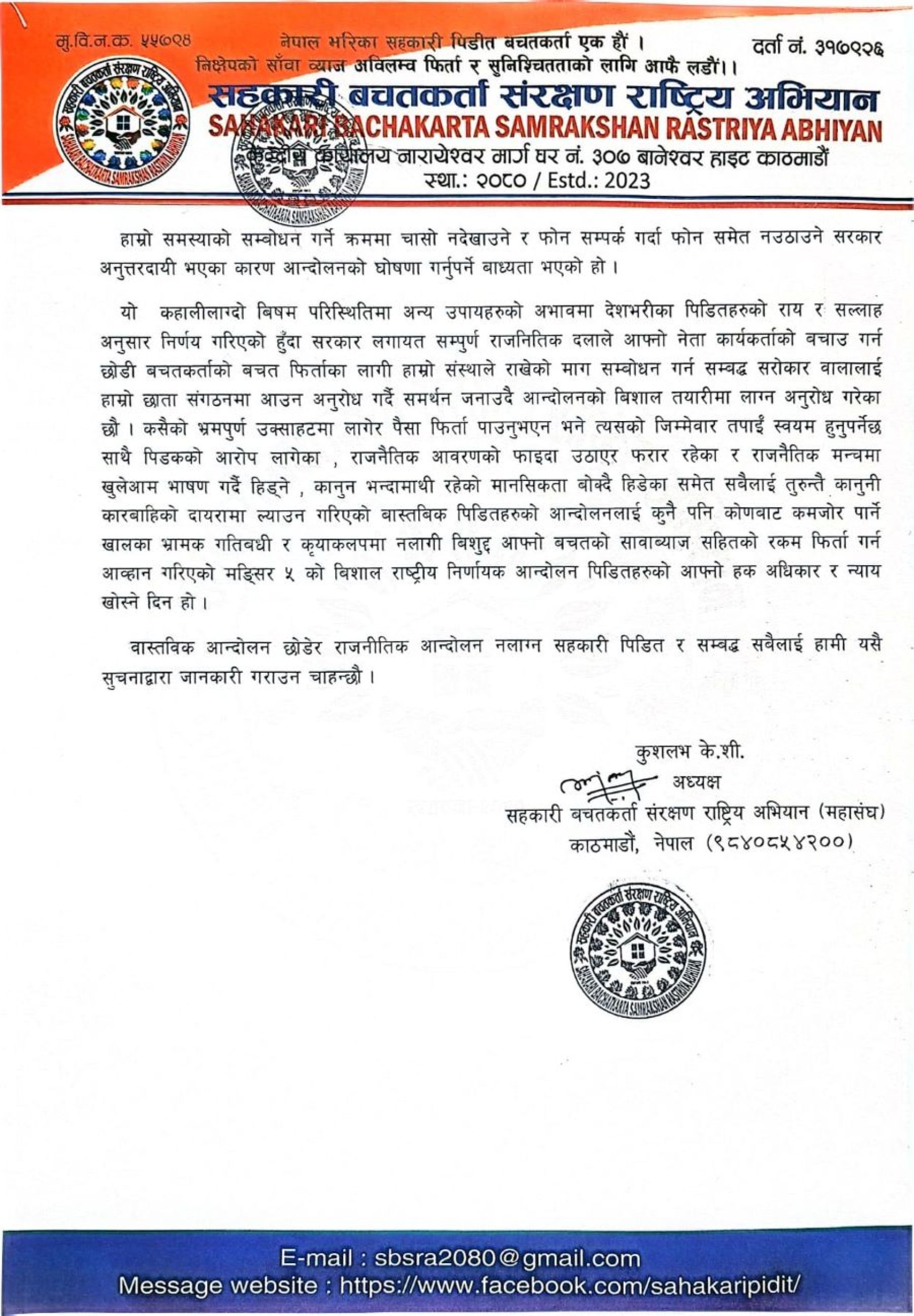 अभियानका अध्यक्ष कुशलब केसीद्वारा जारी विज्ञप्तिमा भनिएको छ, ‘बचत फिर्ता गर्न सरकारले जिम्मा नलिएसम्म बचतकर्ताको रकम फिर्ता हुने देखिँदैन, त्यसैले सरकारले यस विषयमा गम्भीरतापूर्वक लाग्नुपर्नेछ । त्यसैले हाम्रो निर्णायक आन्दोलन मंसिर ५ मा हो । हामी आन्दोलनमा उत्रिने बाध्यता सरकारले बनायो ।’