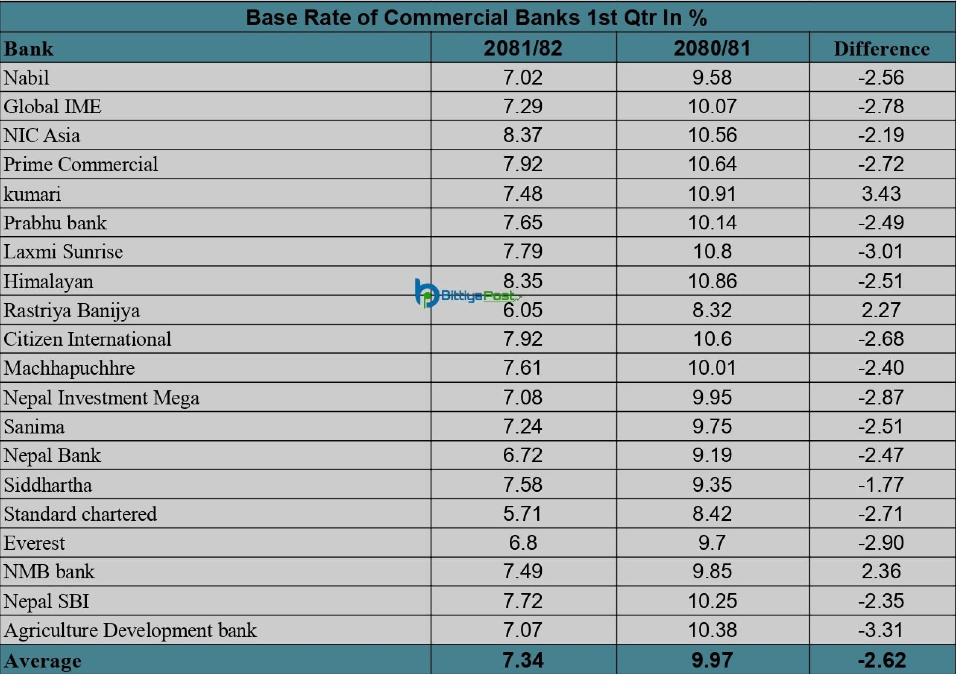 यस्तै, एभरेष्ट बैंकको बेस रेट पनि ६.०८ प्रतिशत रहेको छ । त्यस्तै नेपाल बैंकको आधार दर ६.७२ प्रतिशत, नबिल बैंककोे ७.०२ प्रतिशत, कृषि विकास बैंकको ७.०७ प्रतिशत, नेपाल इन्भेष्टमेन्ट मेगाको ७.०८ र सानिमाको ७.२४ प्रतिशत रहेको छ ।