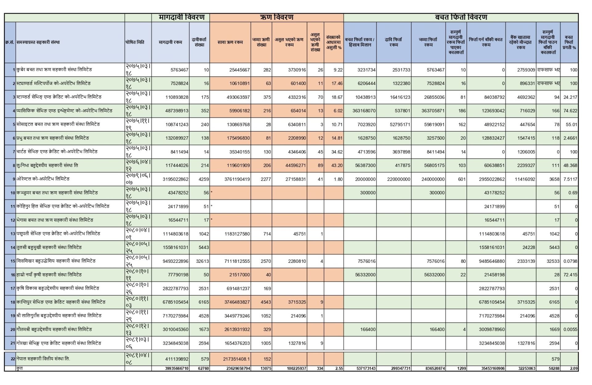 अध्यक्ष गौतमका अनुसार समस्याग्रस्त घोषित सहकारीमा हालसम्म ६२ हजार ७६० बचतकर्ताले ३९ अर्ब ९३ करोड ५६ लाख ६६ हजार रुपैयाँ बराबरको माग दाबी परेको छ । तर, कार्यालयले हालसम्म एक हजार २९९ पीडित सदस्यहरूको ८३ करोड ६५ लाख २० हजार रुपैयाँ बचत फिर्ता गरेको छ । यस अवधिमा तीन सहकारीको सम्पत्ति र दायित्व राफसाफ भएको छ ।