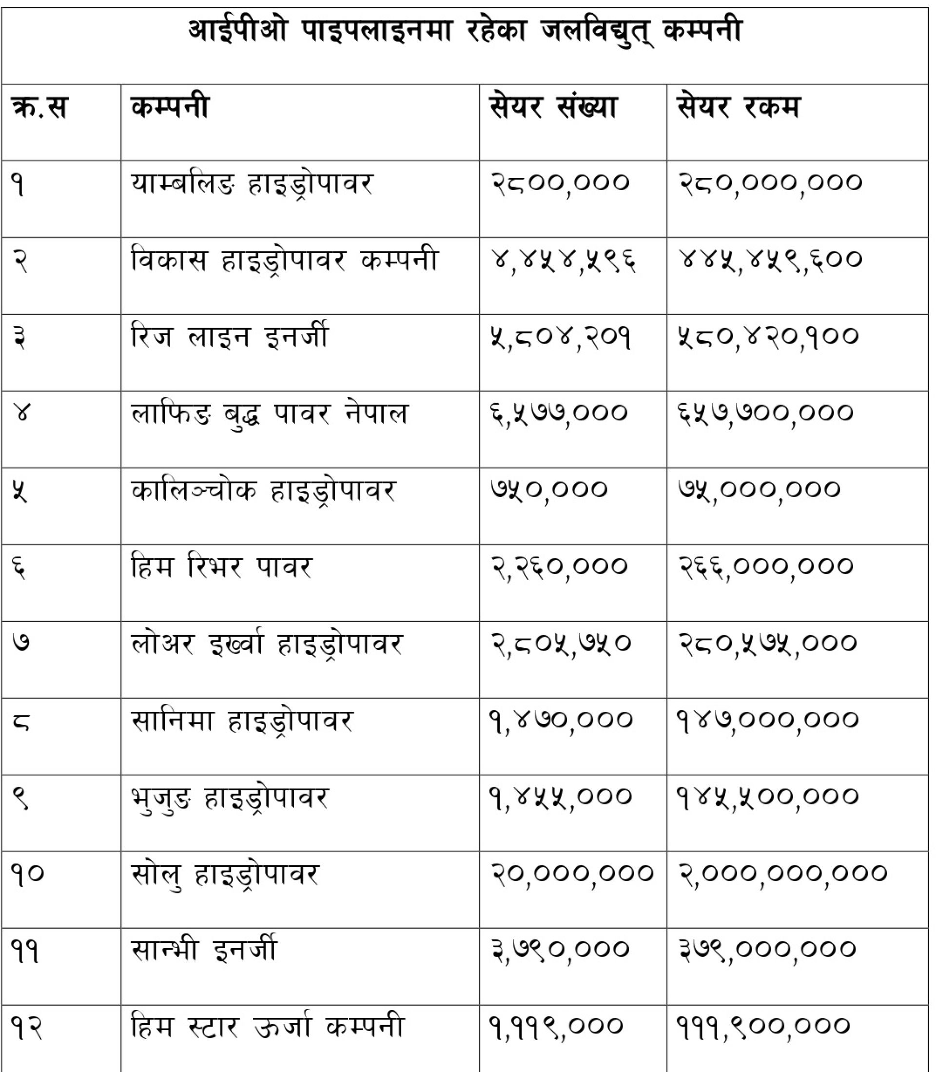 निजी क्षेत्रले आयोजना निर्माण गर्दा आफूले २० प्रतिशत सम्पत्ति (इक्विटी) हालेर ८० प्रतिशतसम्म बैंकबाट ऋण लिने गरेको छ । जलविद्युत् कम्पनीको १० प्रतिशत सेयर हिस्सा अनिवार्य रूपमा स्थानीयलाई दिनुपर्ने प्रावधान छ । अरू केही हिस्सा सर्वसाधारण (पब्लिक) लाई पनि बिक्री गर्न पाइन्छ । तर, पछिल्लो समय १८ महिनादेखि नेपाल धितोपत्र बोर्डले कम्पनीहरूको फाइल रोकेकाले पुँजी जुटाउने कार्य कठिन भइरहेको छ ।