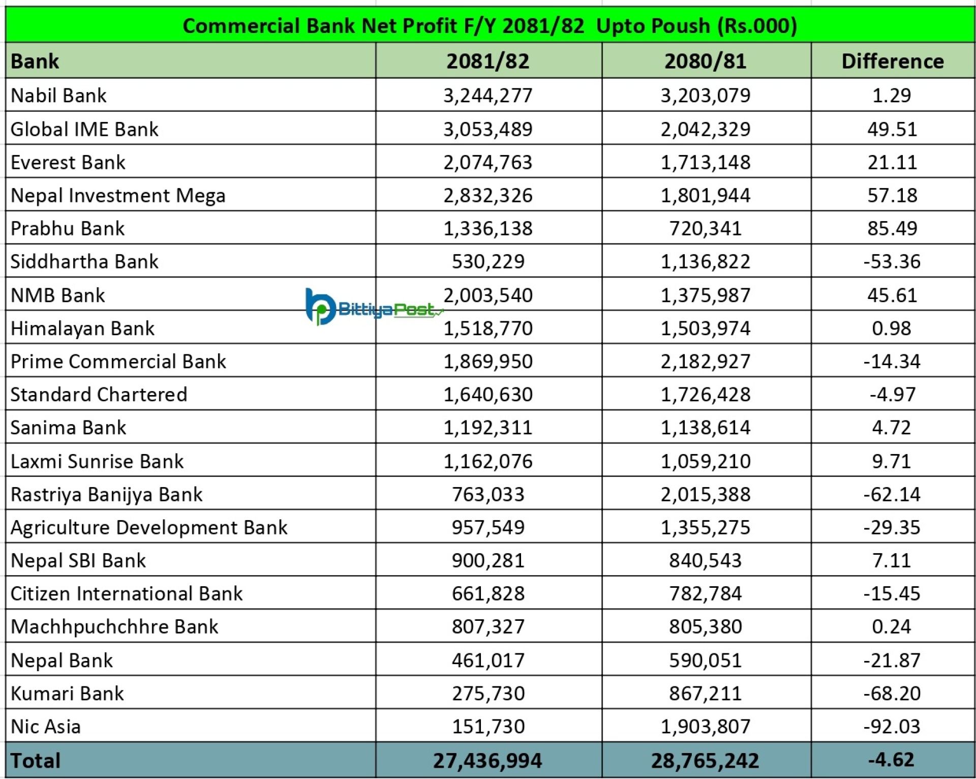 पुस मसान्तसम्म बैंकहरुले २७ अर्ब ४३ करोड ६९ लाख ९४ हजार रुपैयाँ नाफा कमाएका छन् । जुन गत आवको सोही अवधिको तुलनामा एक अर्ब ३२ करोड ८२ लाख ४८ हजार रुपैयाँले कम हो । गत वर्ष बैंकहरुको नाफा २८ अर्ब ७६ करोड ५२ लाख ४२ हजार रुपैयाँ रहेको थियो ।