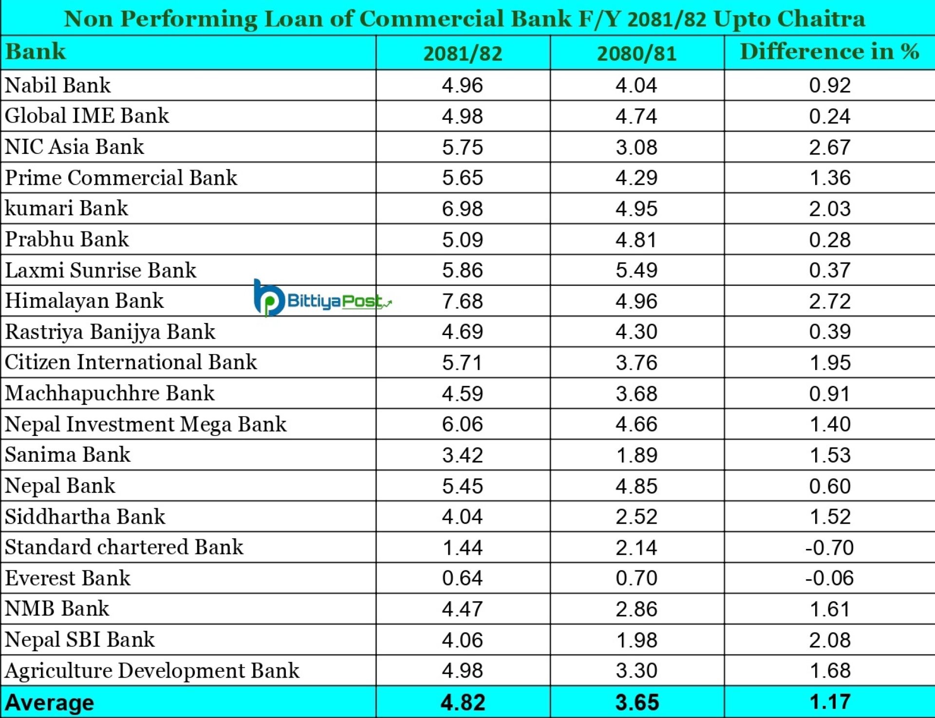 चैत मसान्तसम्म आइपुग्दा १८ वटा बैंकहरुको खराब कर्जा बढेको छ भने दुई बैंकको खराब कर्जा घटेको छ । यस अवधिमा हिमालयन बैंकको खराब कर्जा सर्वाधिक बढेको छ ।