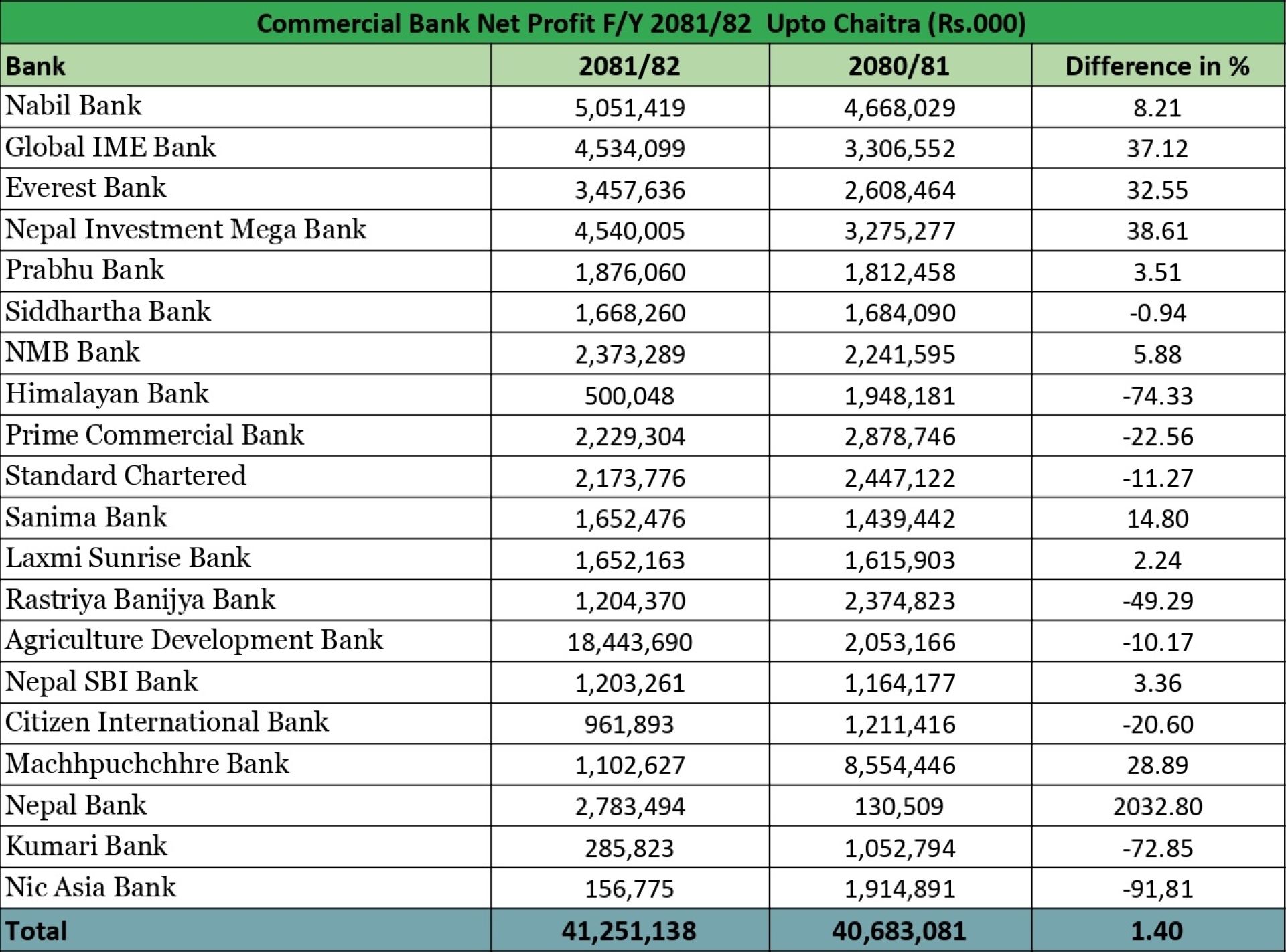 बैंक तथा वित्तीय संस्थाहरुको खराब कर्जा बढ्दा त्यसको प्रभाव बैंकहरुको वित्तीय रिपोर्ट (ब्यालेन्स सिट) मा परेको छ । आर्थिक वर्ष २०८१/८२ को वित्तीय रिपोर्ट अनुसार यस अवधिमा बैंकहरुले ४१ अर्ब बढी नाफा कमाएका छन् ।