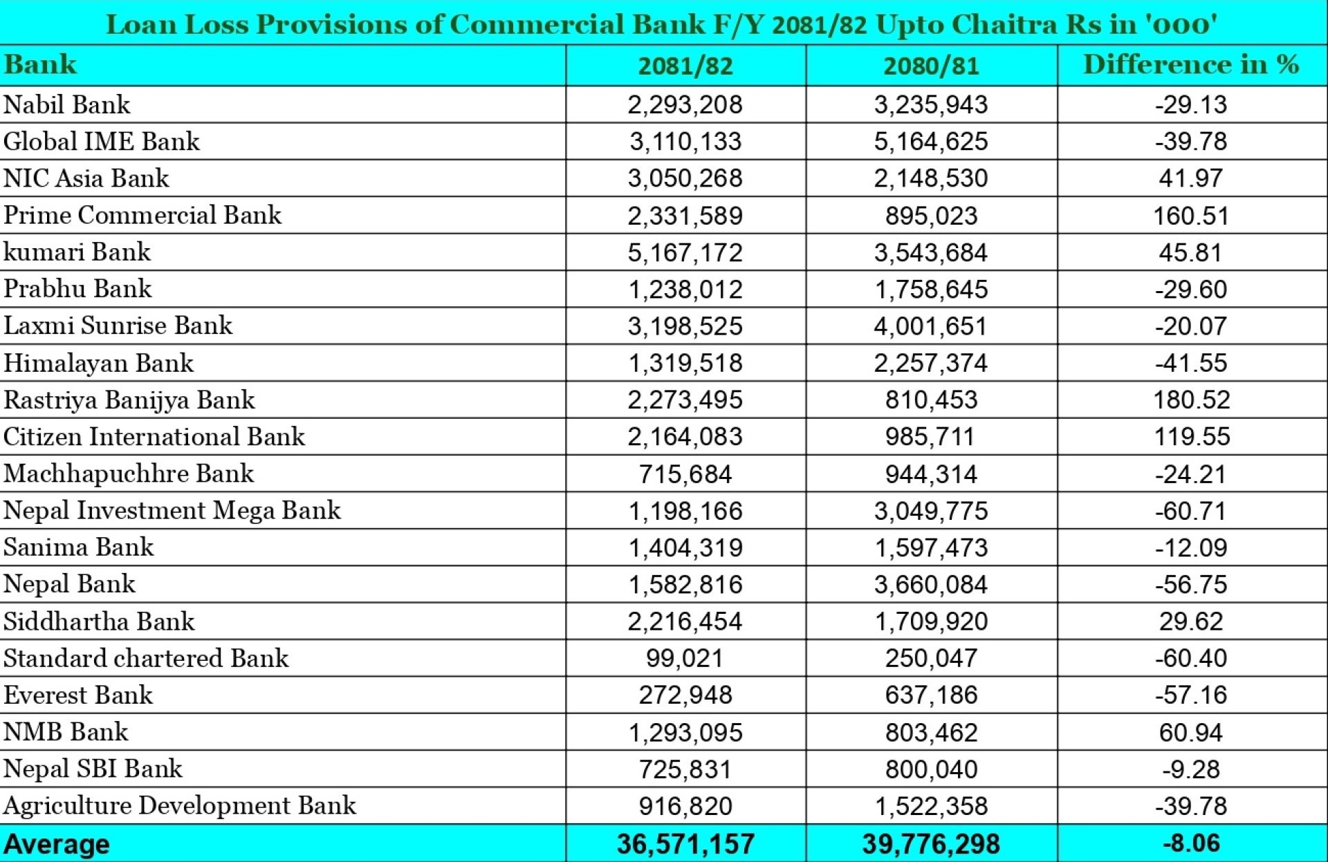 चालु आर्थिक वर्षको चैत मसान्तसम्ममा वाणिज्य बैंकहरुले कर्जा तथा नोक्सानी व्यवस्था गर्न ३६ अर्ब ५७ करोड ११ लाख रुपैयाँ छुट्याएका छन् । उक्त रकम गत वर्षको सोही अवधिको तुलनामा ८.०६ प्रतिशतले कम हो । बैंकहरुले गत वर्ष ३९ अर्ब ७७ करोड ६२ लाख रुपैयाँ कर्जा नोक्सानीका लागि व्यवस्था गरेका थिए ।