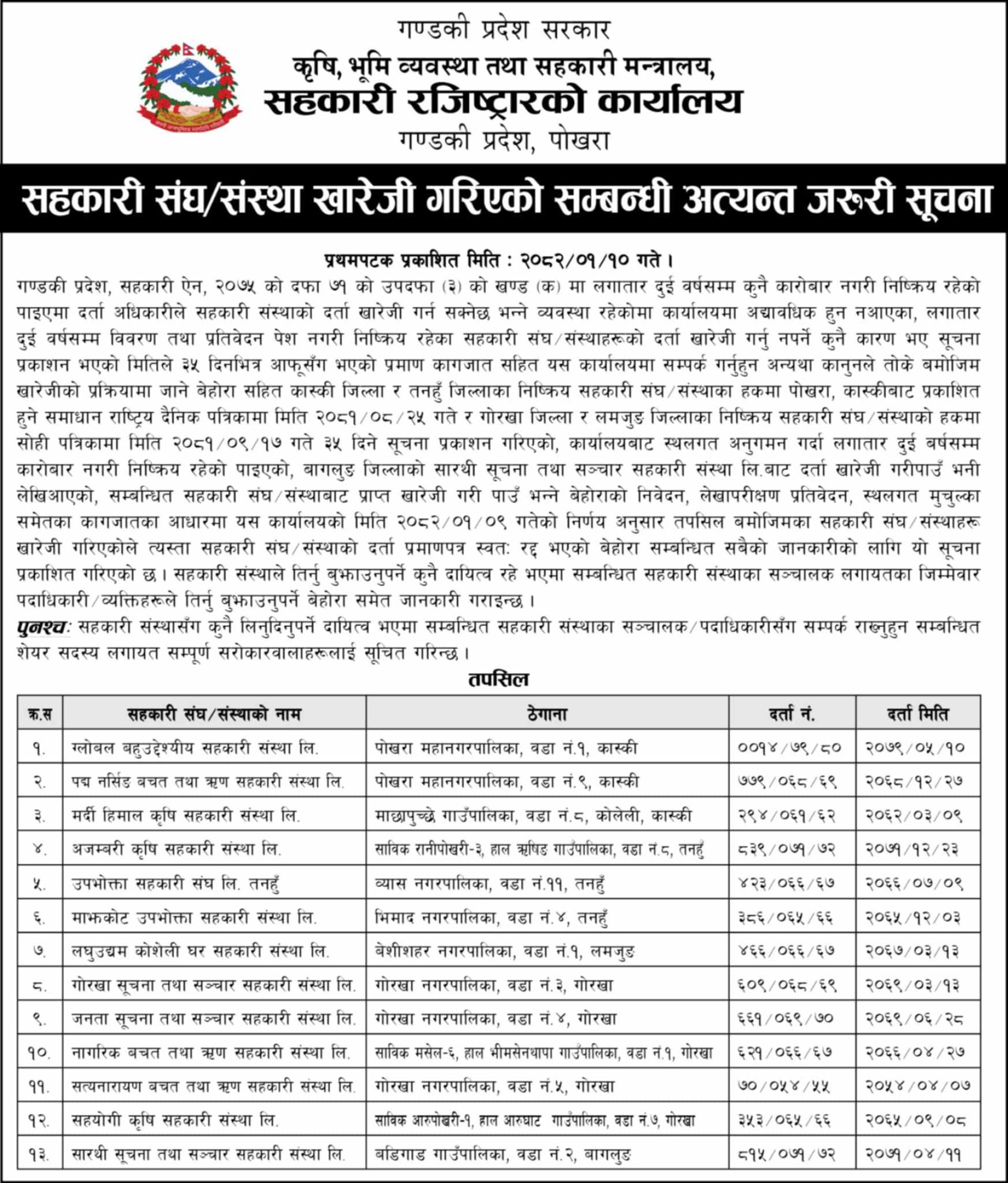 गण्डकी प्रदेश, सहकारी ऐन, २०७५ को दफा ७१ को उपदफा (३) को खण्ड (क) बमोजिम दर्ता खारेज गरिएको जनाएको छ । खारेजी गर्नु नपर्ने कुनै कारण भए सूचना प्रकाशन भएको मितिले ३५ दिनभित्र आफूसँग भएको प्रमाण कागजातसहित कार्यालयमा सम्पर्क गर्न कार्यालयले अनुरोध गरेको छ ।