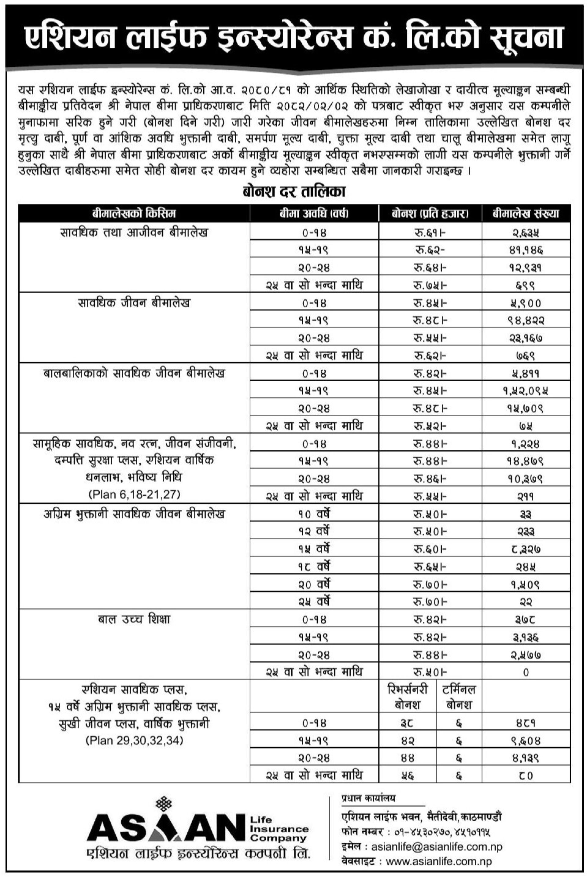त्यसैगरी कम्पनीले एशियन सावधिक प्लस, १५ वर्षे अग्रिम भुक्तानी सावधिक प्लस, सुखी जीवन प्लस, वार्षिक भुक्तानी बीमालेखमा रिभर्सनी बोनस ३८ रुपियाँदेखि ५६ रुपियाँसम्म र टर्मिनल बोनस सबै बीमा अवधिमा समान ६ रुपियाँ दिने घोषणा गरेको छ ।