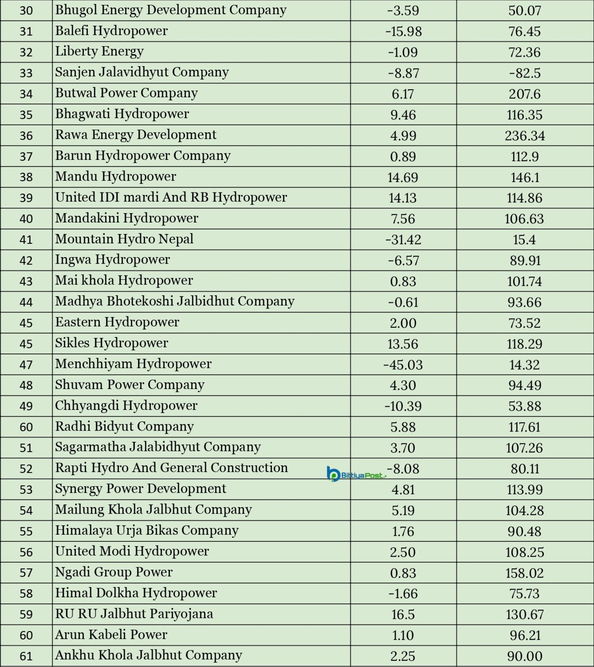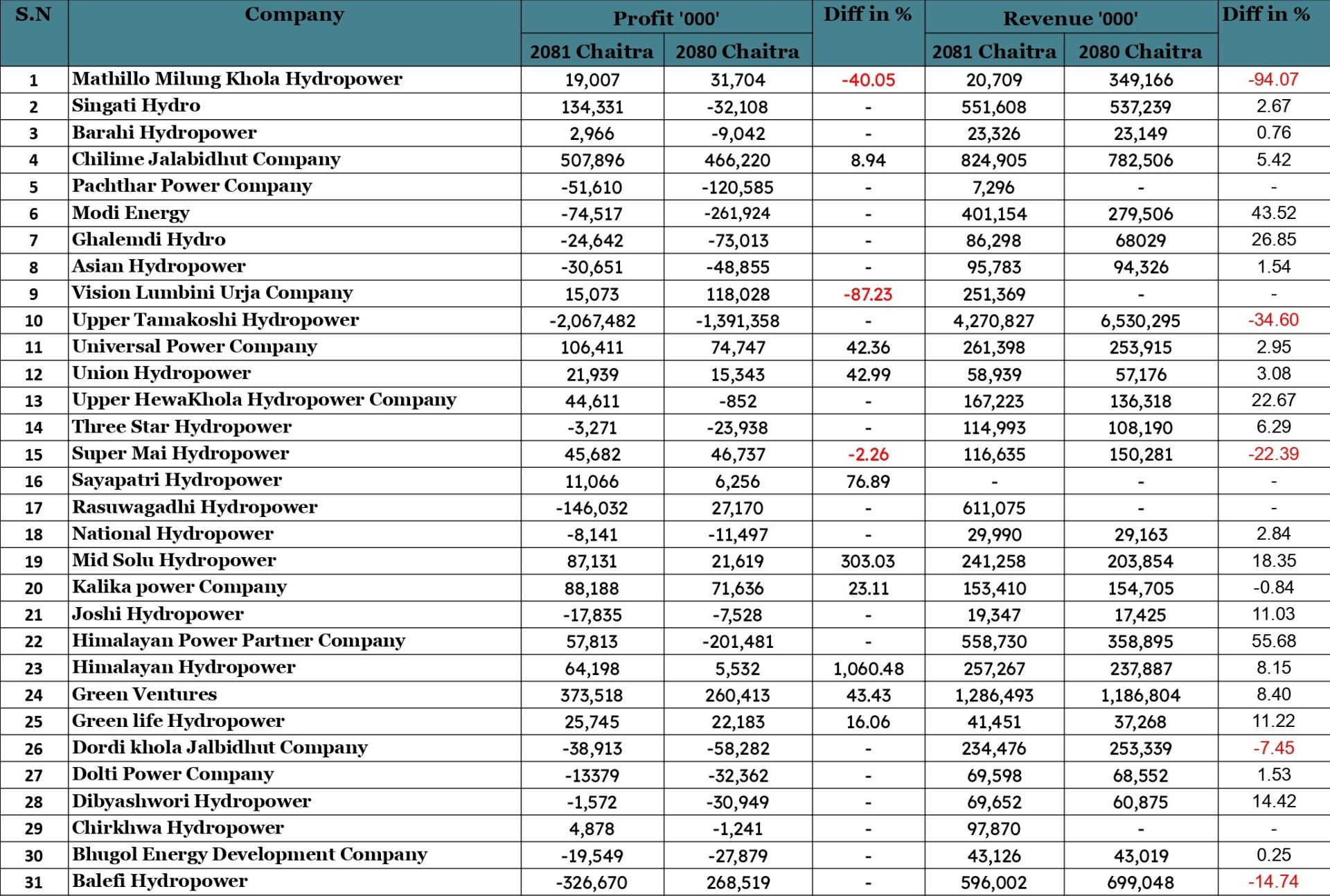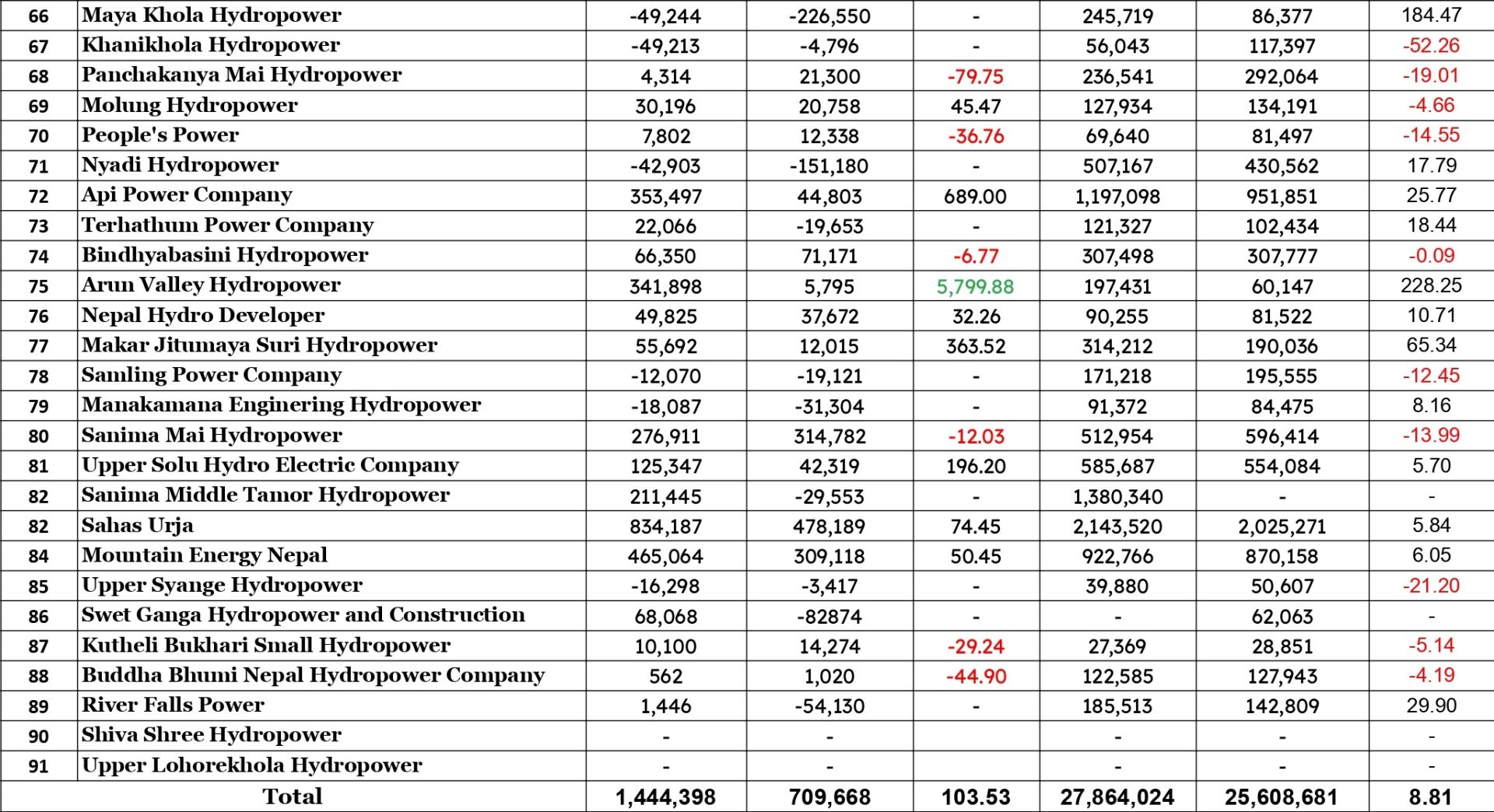 त्यस्तै यस अवधिमा आइपुग्दा हिमालयन हाइड्रोपावर कम्पनीको नाफा १०६०.४८ प्रतिशतले बढेको छ । मकर जीतुमाया सुरी हाइड्रोपावरको नाफा ३६३.५२ प्रतिशत र युनाइडेड इदी मार्दी एण्ड आरबी हाइड्रोपावरको नाफा १०८.५० प्रतिशतले बढेको छ ।