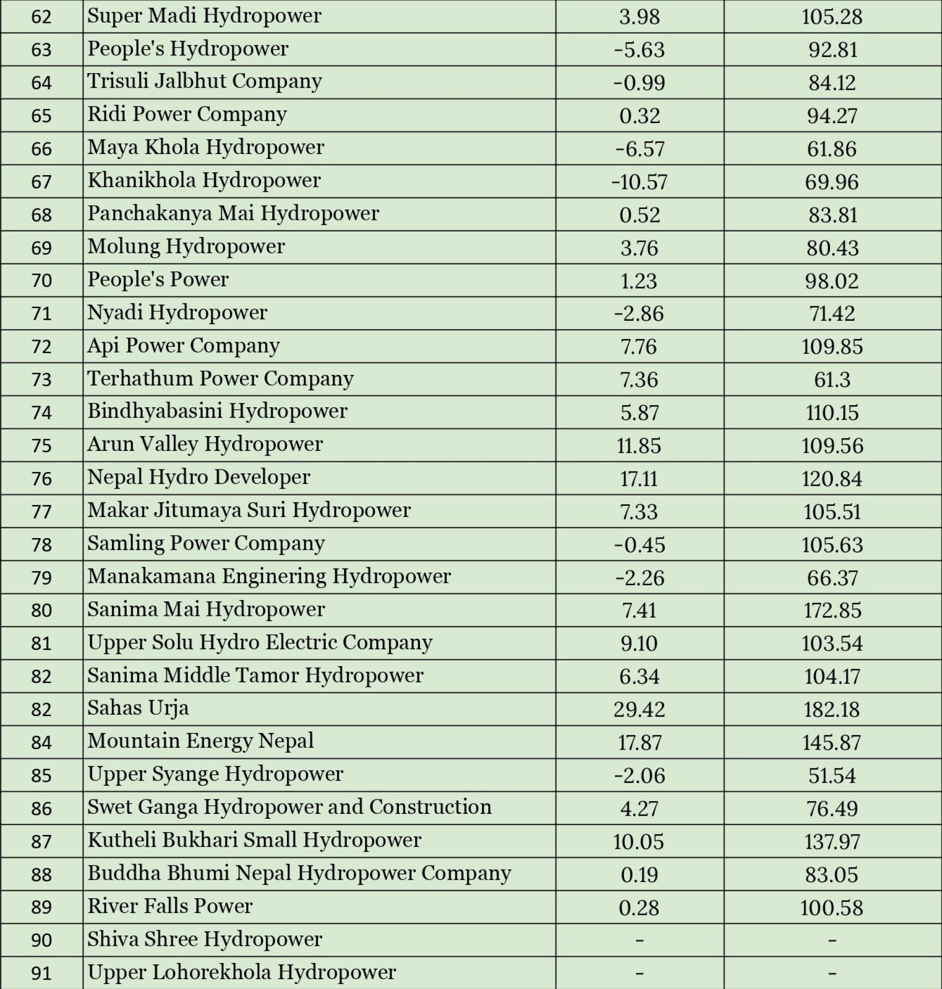 त्यस्तै यस अवधिमा मैलुङ खाृला जलविद्युत कम्पनीको नाफा १३८.४९ प्रतिशतले बढेको छ भने आँखु खोला जलविद्युत कम्पनीको नाफा पनि १२०९.५३ प्रतिशतले बढेको छ । यस अवधिमा आइपुग्दा अवि पावरको नाफा ६८९ प्रतिशत र अप्पर सोलु हाइड्रो इलेक्ट्रिक कम्पनीको नाफा १९६.२० प्रतिशतले बढेको छ ।