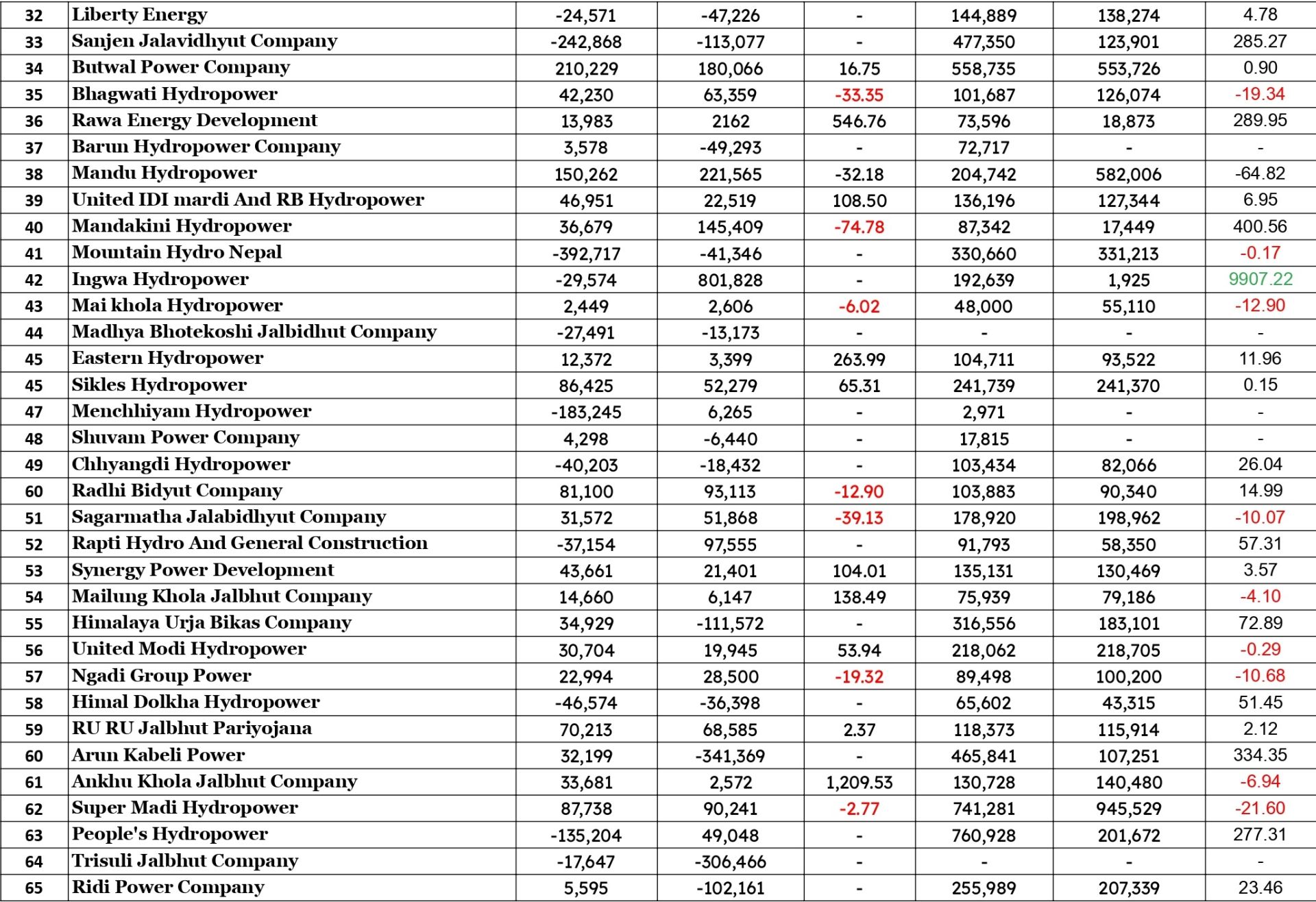यस अवधिमा आइपुग्दा इस्टर्न हाइड्रोपावरको नाफा २६३.९९ प्रतिशतले बढेको छ भने मिड सोलु हाइड्रोपावरको नाफा ३०३.०३ प्रतिशत, रावा इनर्जीको ५७६.७६ प्रतिशत र सिनर्जी पावरको नाफा १०४.०१ प्रतिशतले बढेको छ ।