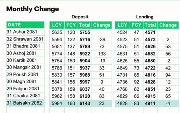 बैशाखसम्म कृषि विकास बैंकले दुई खर्ब ५७ अर्ब, सिटिजन बैंक इन्टरनेशनलले दुई खर्ब एक अर्ब, एभरेष्टले दुई खर्ब ७४ अर्ब, हिमालयनले तीन खर्ब ५ अर्ब, कुमारीले तीन खर्ब ५६ अर्ब, लक्ष्मी सनराइजले तीन खर्ब ५२ अर्ब, माछापुच्छ्रे एक खर्ब ७१ अर्ब र नेपाल बैंकले तीन खर्ब १८ अर्ब रुपैयाँ निक्षेप संकलन गरेका छन् ।