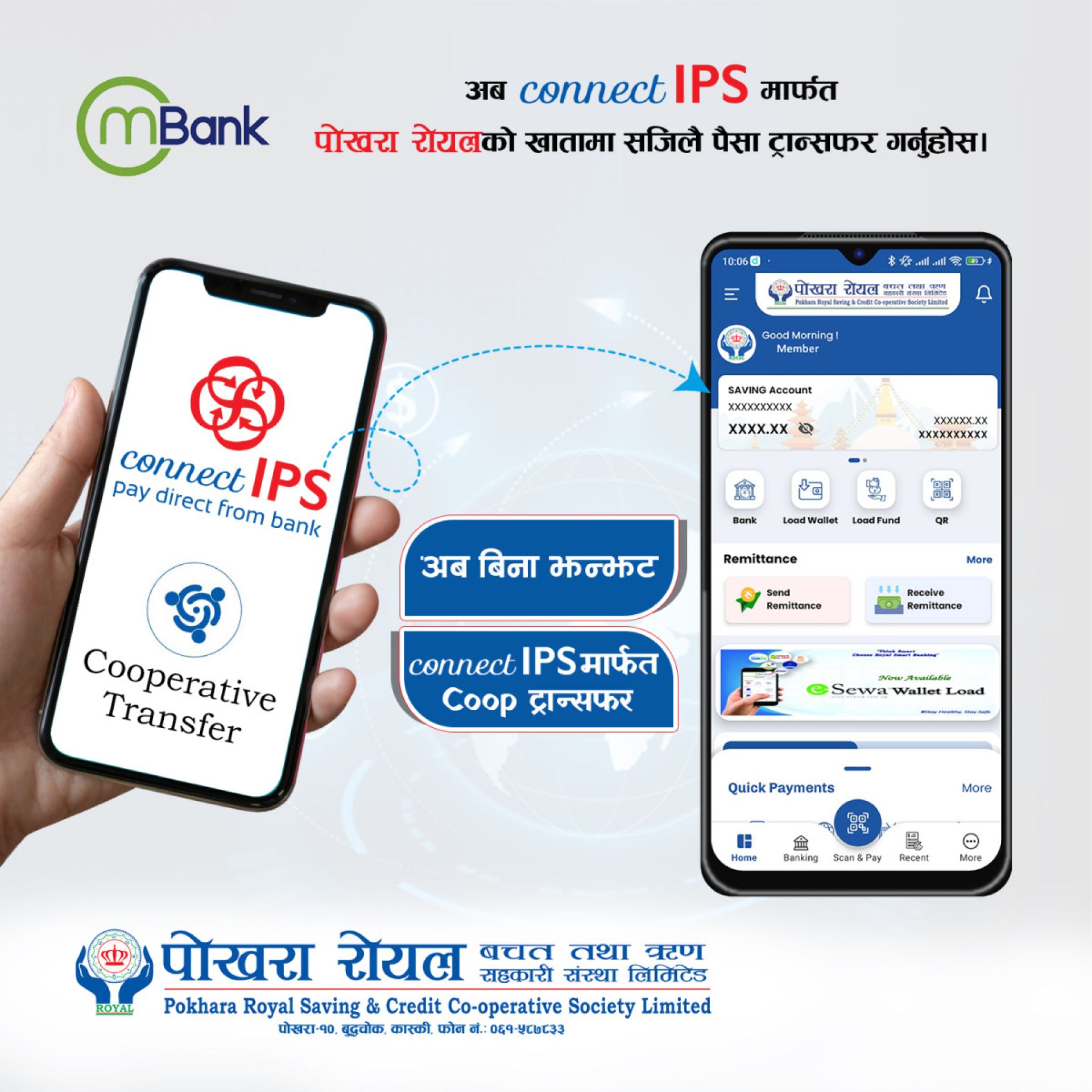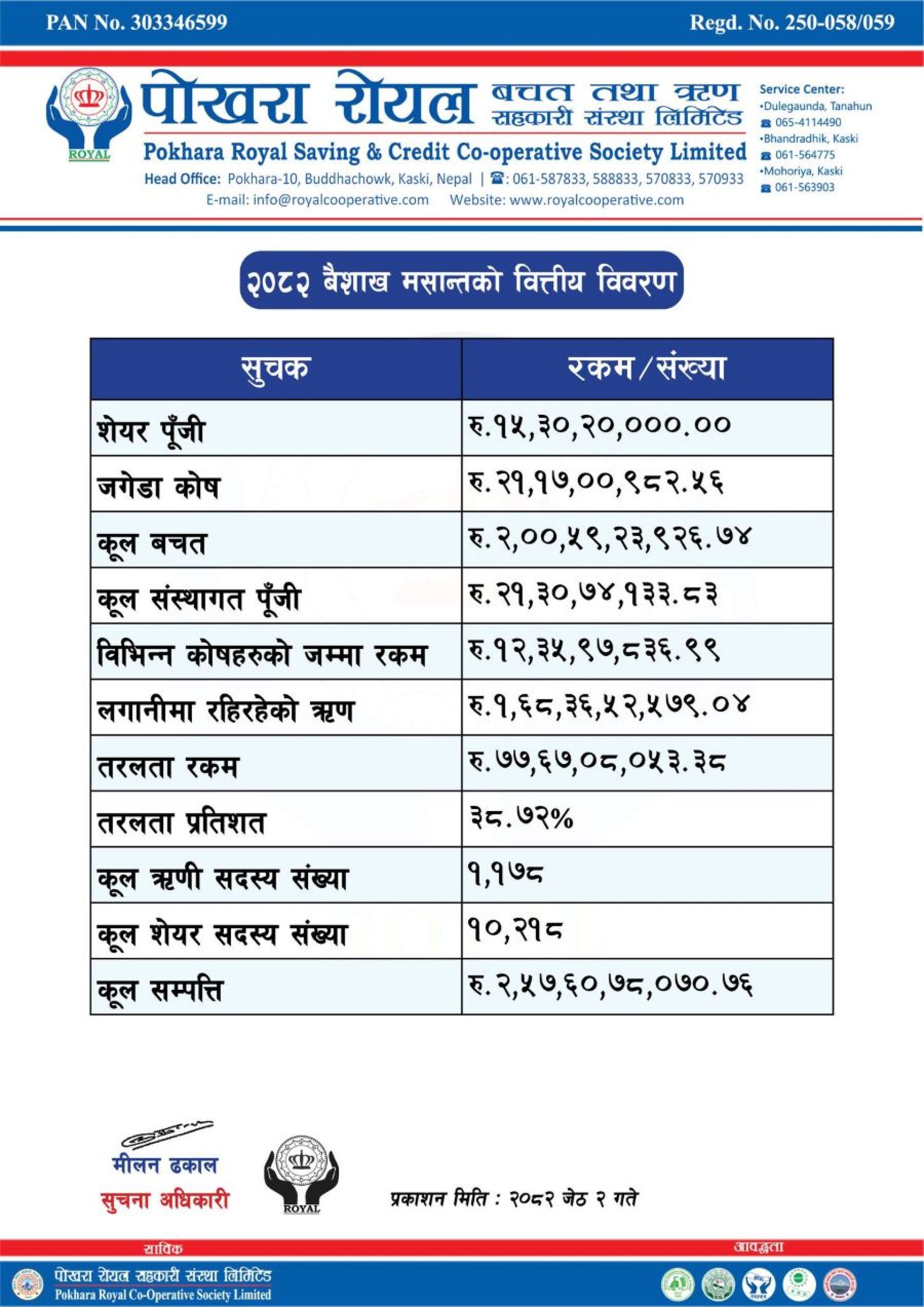 ‘सुखी सदस्य, दिगो सहकारी’को परिकल्पनाका साथ सदस्य सेवामा समर्पित पोखरा रोयल सदस्यमैत्री, प्रविधिमैत्री, विश्वसनीय, सुरक्षित अनि पारदर्शी सेवालाई जोड दिएको छ ।स्थापना दिवसको अवसरमा अध्यक्ष रुद्र कुमारी गुरुङ (मैना) र प्रमुख कार्यकारी अधिकृत भीम बहादुर गुरुङले संयुक्त रुपमा शुभकामनामार्फत सदस्यलाई सुखी बनाउँदै दिगो सहकारी बन्ने पोखरा रोयलको प्रण गरेका छन् ।