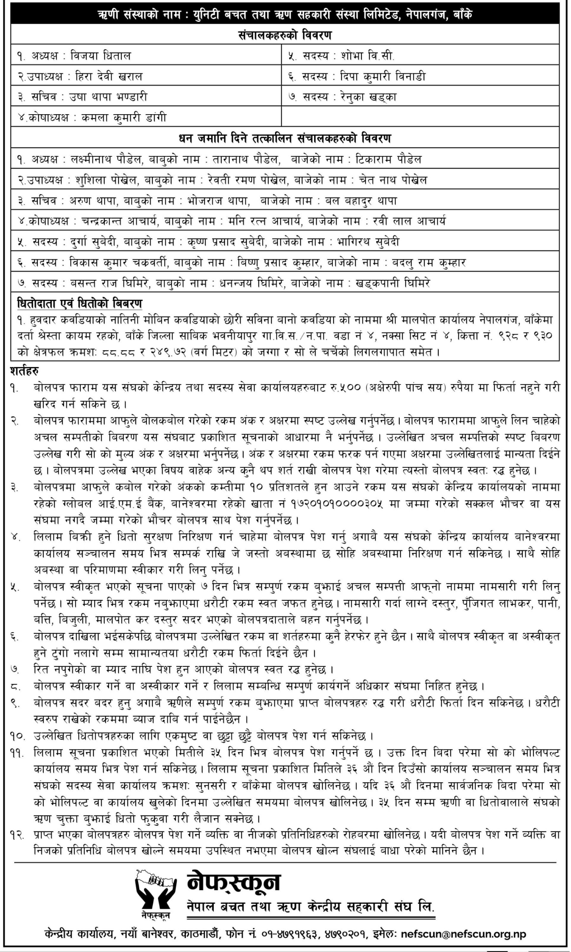 संस्थाले धितो सुरक्षण वापत राखेको सविना बानो कवडियाको नाममा मालपोत कार्यालय नेपालगञ्ज, बाँकेमा दर्ता श्रेता कायम रहेको जग्गा नेफ्स्कूनले लिलामी गर्न लागेको हो ।