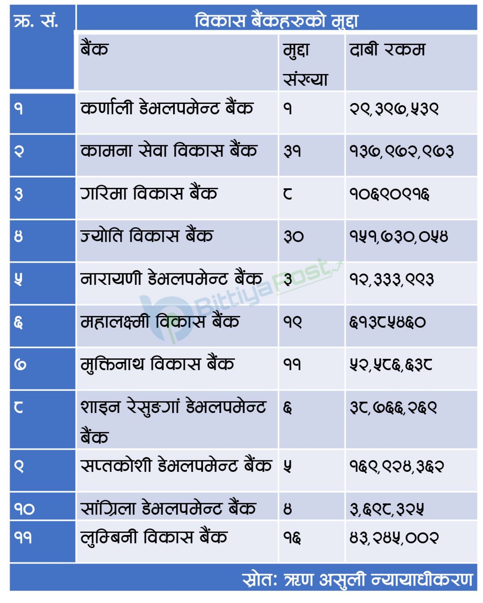 न्यायाधीकरणका अनुसार गत वर्षमा ११ विकास बैंकहरुले ७० करोड ८० लाख ३२ हजार रुपैयाँ बराबरको मागदाबी गर्दै १३० वटा मुद्दा दायर गरेका छन् । जसमध्ये अधिकांश बैंकहरुको ३२ वटा मुद्दाहरुको भने निर्णय भएको न्यायाधीकरणले जनाएको छ ।