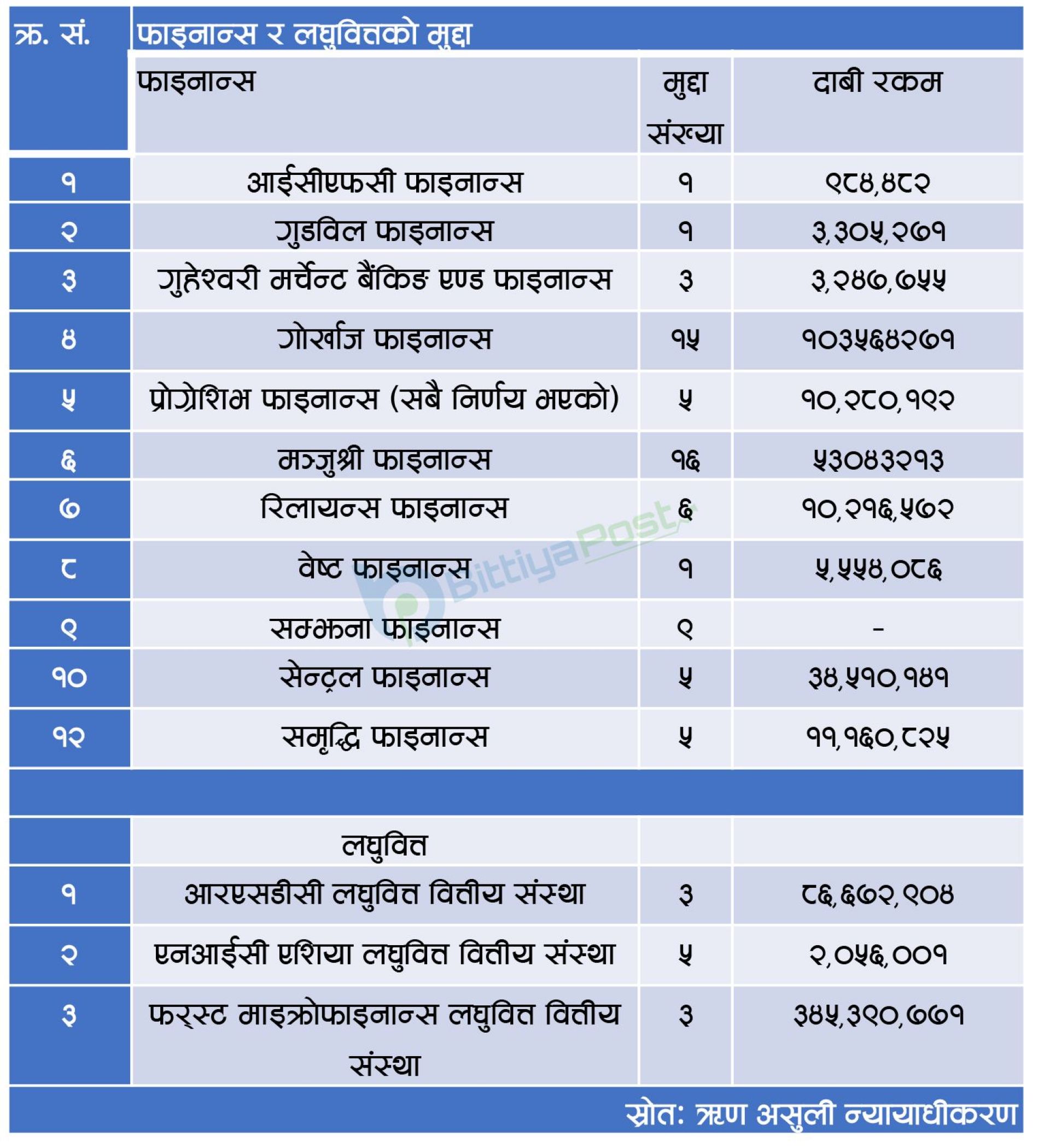 यसैगरी समीक्षा अवधिमा फाइनान्स कम्पनीबाट २३ करोड ५८ लाख ६६ हजार रुपैयाँ बराबरको मागदाबीसहित ६७ वटा मुद्दा परेका छन् । सूचना अधिकारी ढकालका अनुसार लगानीको रकम उठाउन नसकेको भन्दै ४३ करोड ४१ लाख १९ हजार रुपैयाँ बराबरको मागदावी सहित तीनवटा माइक्रोफाइनान्स कम्पनीले ११ वटा मुद्दा दायर गरेका छन् ।