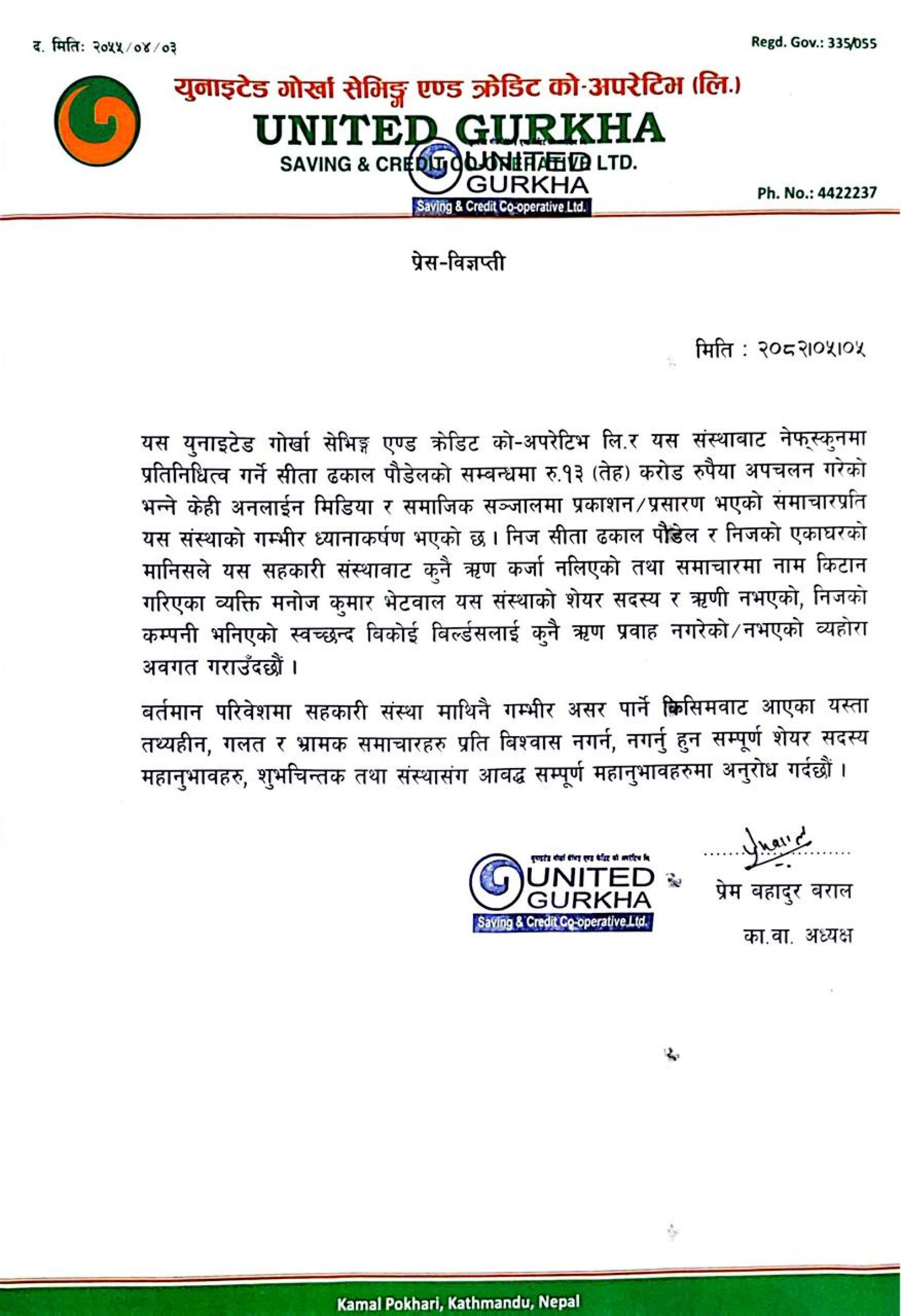 काठमाडौं : युनाइटेड गोर्खा सेभिङ्ग एण्ड क्रेडिट को-अपरेटिभ लिमिटेडले आफ्नो संस्थाको बचत रकम अपचलन नभएको बताएको छ। संस्थाका कार्यवाहक अध्यक्ष प्रेम बहादुर बरालले विज्ञप्तिमार्फत संस्थाको रकम व्यक्ति तथा कम्पनीले अपचलन नगरेको बताएका हुन् ।