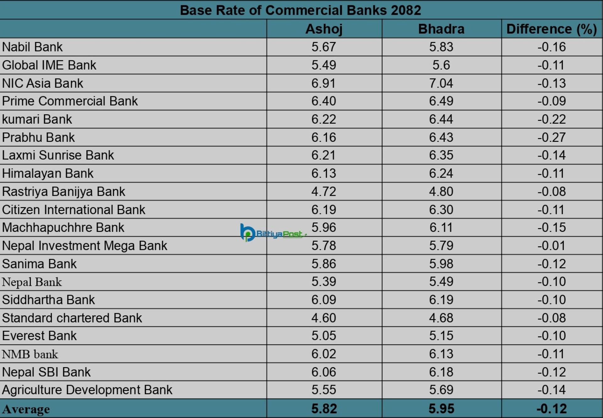 गत भदौमा ५.९५ प्रतिशत रहेको बैंकहरुको बेसरेट घटेर ५.८२ प्रतिशतमा झरेको छ । पछिल्लो केही महिनायता बैंकहरुको ब्याजदर निरन्तर घट्दो क्रममा छ । जसका कारण बैंकहरुको बेस रेट पनि घटेको हो ।