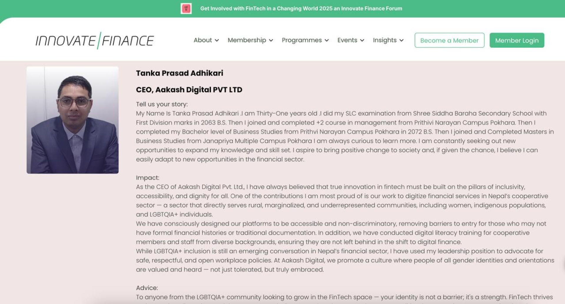 इनोभेट फाइनान्स यूकेको अग्रणी फिनटेक संस्था हो, जसको उद्देश्य विश्वव्यापी वित्तीय प्रविधि क्षेत्रमा समावेशी, सुरक्षित र नवप्रवर्तनशील वातावरण निर्माण गर्नु हो। संस्थाले Pride in FinTech Powerlist मार्फत हरेक वर्ष यस्ता अग्रणी व्यक्तित्वहरूलाई सम्मान गर्छ, जसले विविधता र समानताको मूल्यलाई प्रविधिसँग जोड्दै समाजमा प्रभाव पारिरहेका छन् ।