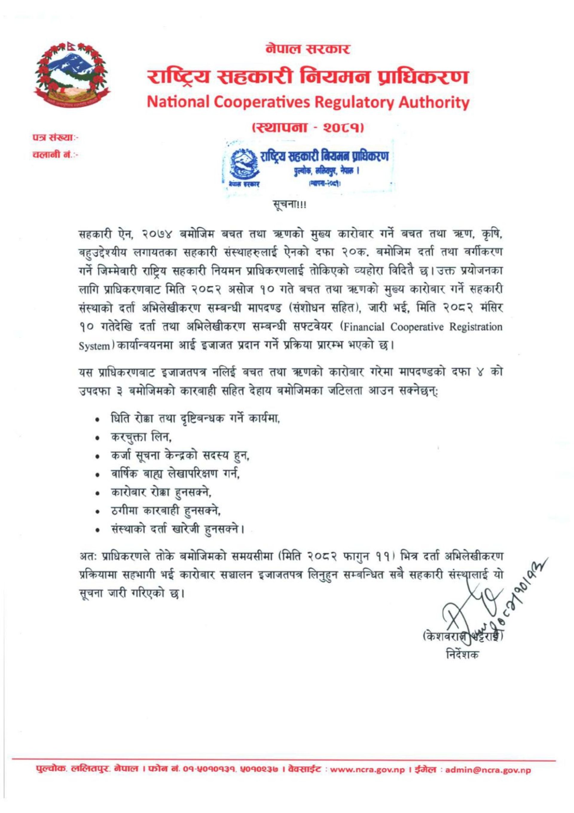 सहकारी ऐन, २०७४ बमोजिम बचत तथा ऋणको मुख्य कारोबार गर्ने बचत तथा ऋण, कृषि, बहुउद्देश्यीयलगायतका सहकारी संस्थालाई फागुन ११ गतेभित्र अनिवार्य रूपमा इजाजतपत्र लिन प्राधिकरणले आग्रह गरेको छ।