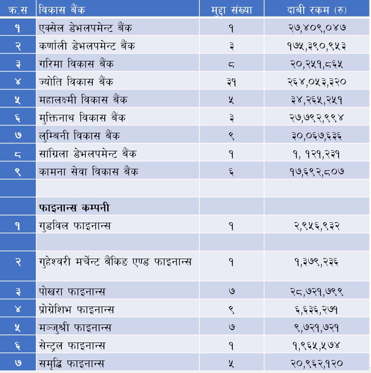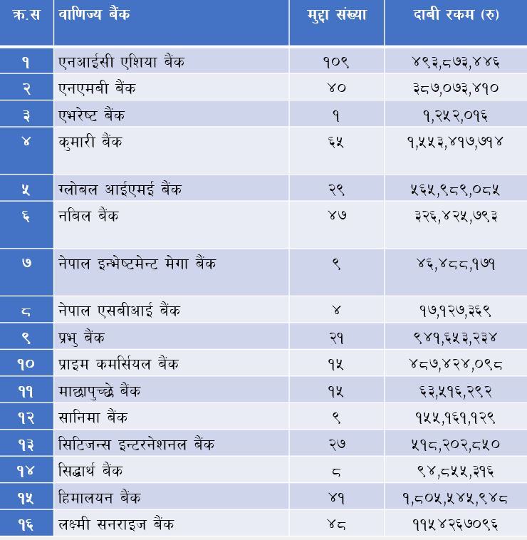 कर्जा असुलीमा समस्या बढ्दै जाँदा ऋण असुली न्यायाधिकरणमा मुद्दाको चाङ लागेको छ । चालु आर्थिक वर्षको पुस मसान्तसम्म ५८६ वटा मुद्दा दायर भएका छन्, जसमा बैंकहरूले करिब ९ अर्ब ६८ करोड रुपैयाँ बराबरको दाबी गरेका छन् । अधिकांश मुद्दा निर्माण, व्यापार र सेवा क्षेत्रसँग सम्बन्धित रहेका छन् ।