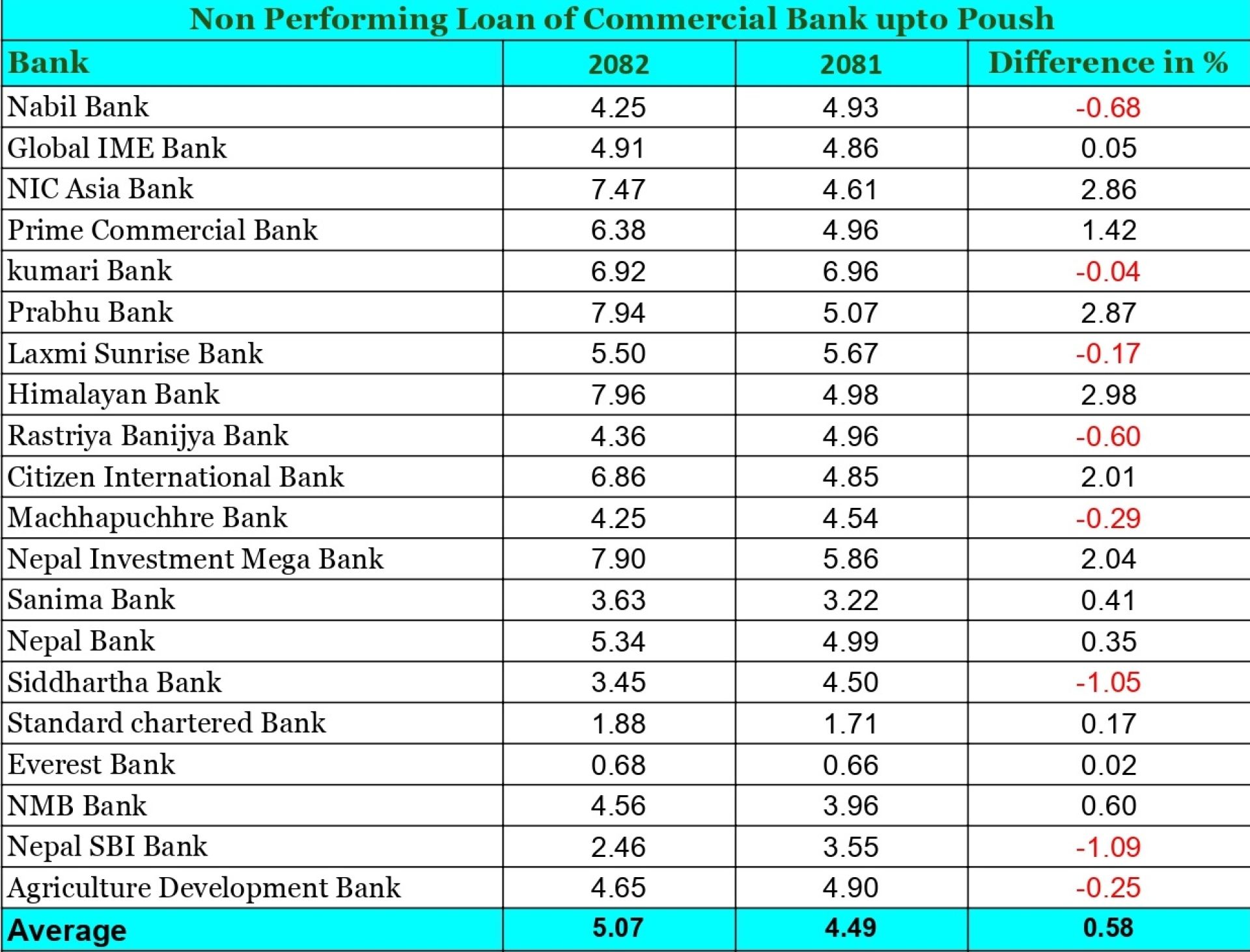 हिमालयन बैंकको एनपीएल ५९.८३ प्रतिशतले बढेर ७.९६ प्रतिशत पुगेको छ भने प्रभु बैंक, सिटिजन्स बैंक, नेपाल इन्भेस्टमेन्ट मेगा बैंक, प्राइम बैंक र एनएमबि बैंकमा पनि एनपीएल उल्लेख्य रूपमा बढेको छ ।