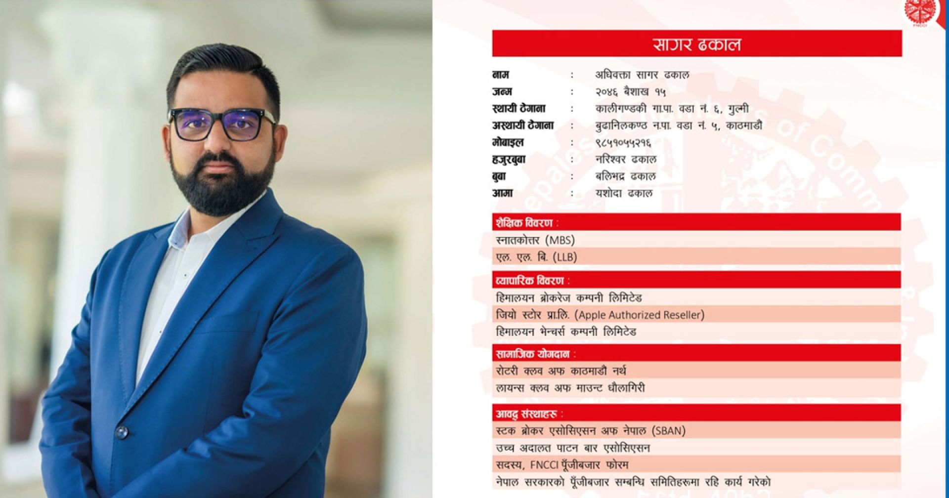 काठमाडौं : नेपाल उद्योग वाणिज्य महासंघको आसन्न निर्वाचनमा सागर ढकालले वस्तुगत तर्फबाट केन्द्रीय सदस्यमा उम्मेद्वारी घोषणा गरेका छन् । नेपाल स्टक ब्रोकर एसोसिएसनका अध्यक्ष ढकालले वस्तुगततर्फका उपाध्यक्ष नरेशलाल श्रेष्ठको समुहबाट केन्द्रीय कार्यकारिणी सदस्यमा उम्मेदवारी घोषणा गरेका हुन्।