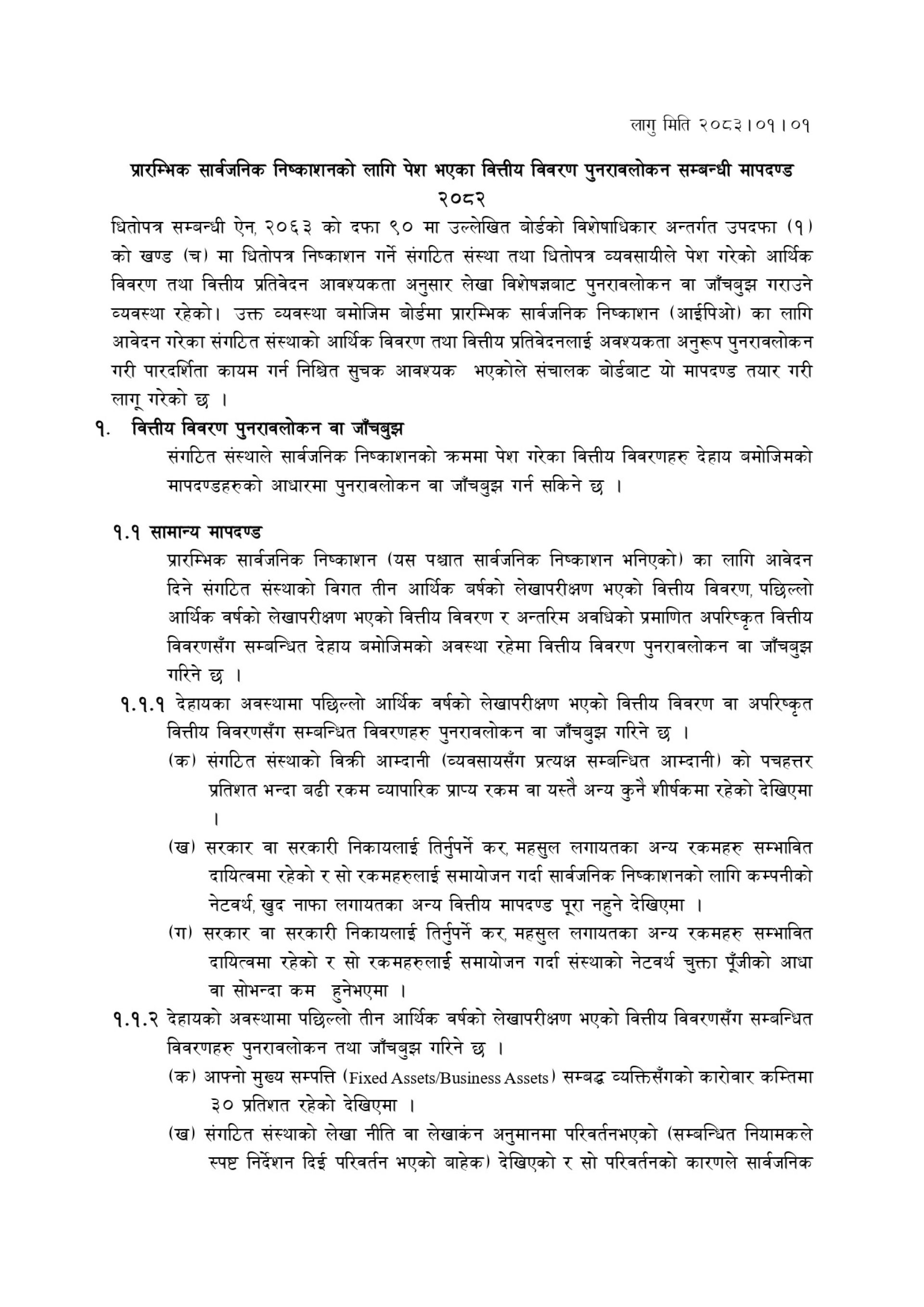 काठमाडौं : नेपाल धितोपत्र बोर्डले चैत २३ गते बसेको बोर्ड बैठकमा प्रारम्भिक सार्वजनिक निष्काशन (आईपीओ) का लागि पेश भएका वित्तीय विवरण पुनरावलोकन सम्बन्धी मापदण्ड, २०८२ स्वीकृत गरेको छ। उक्त मापदण्ड २०८३ बैशाख १ गतेदेखि लागू हुने भएको छ।