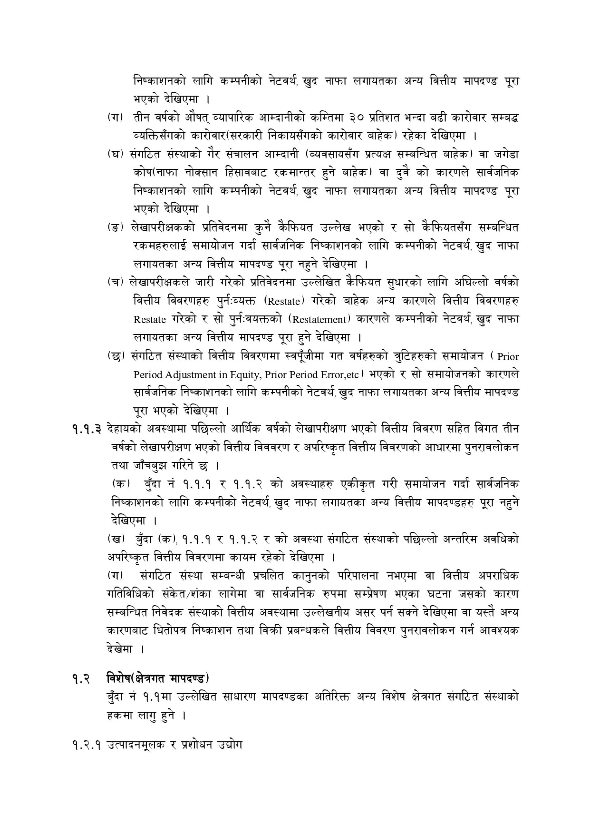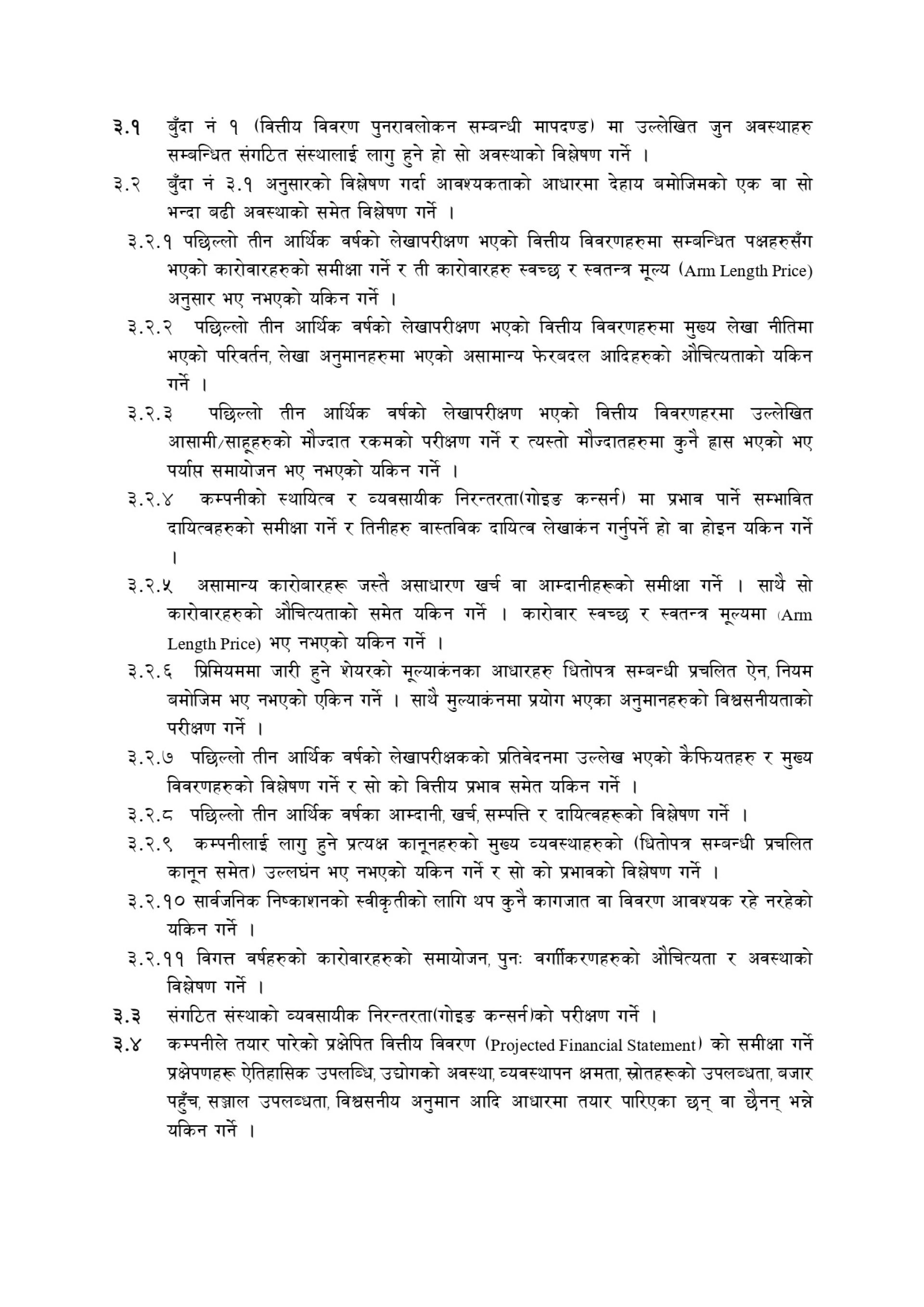 यदि संस्थाको विक्री आम्दानीको ७५ प्रतिशत भन्दा बढी रकम व्यापारिक प्राप्य वा अन्य शीर्षकमा रहेको छ, वा कर, महसुल लगायतको सम्भावित दायित्वले कम्पनीको नेटवर्थ वा खुद नाफामा असर गर्ने स्थिति देखिन्छ भने वित्तीय विवरणको पुनरावलोकन वा जाँचबुझ आवश्यक पर्नेछ ।