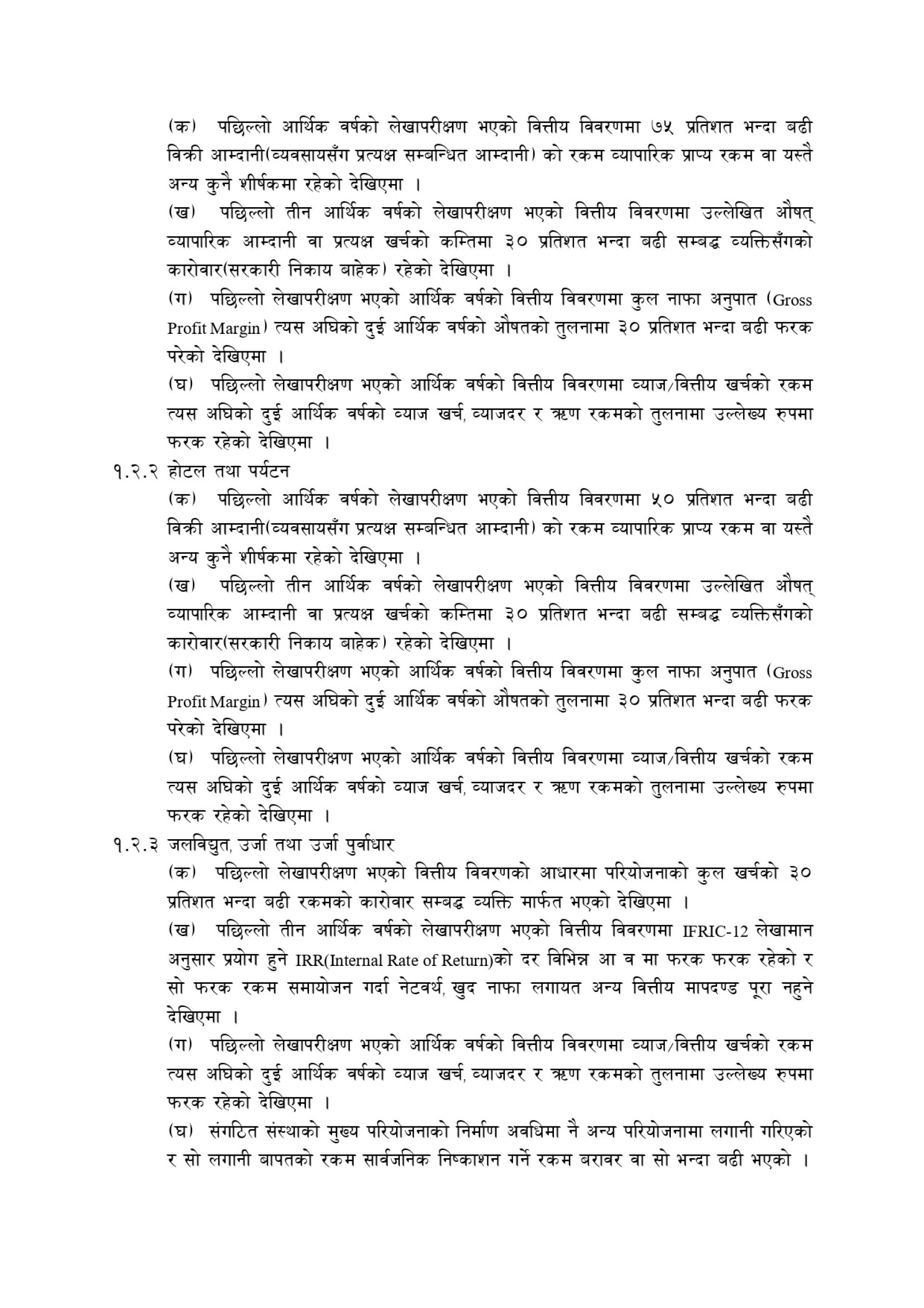 उत्पादनमूलक र प्रशोधन उद्योग, होटल तथा पर्यटन, जलविद्युत र ऊर्जा परियोजना, तथा लगानी कम्पनीहरूको लागि फरक-फरक प्रावधानहरू राखिएको छ। उत्पादनमूलक उद्योगमा यदि पछिल्लो आर्थिक वर्षको विक्री आम्दानीको ७५ प्रतिशत भन्दा बढी व्यापारिक प्राप्य रकममा रहेको छ भने पुनरावलोकन अनिवार्य हुनेछ।